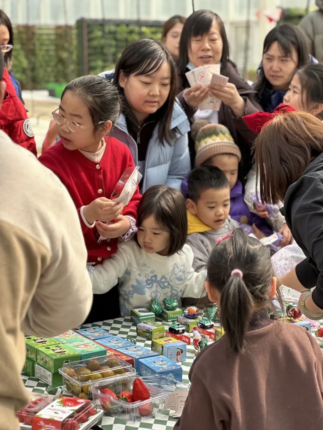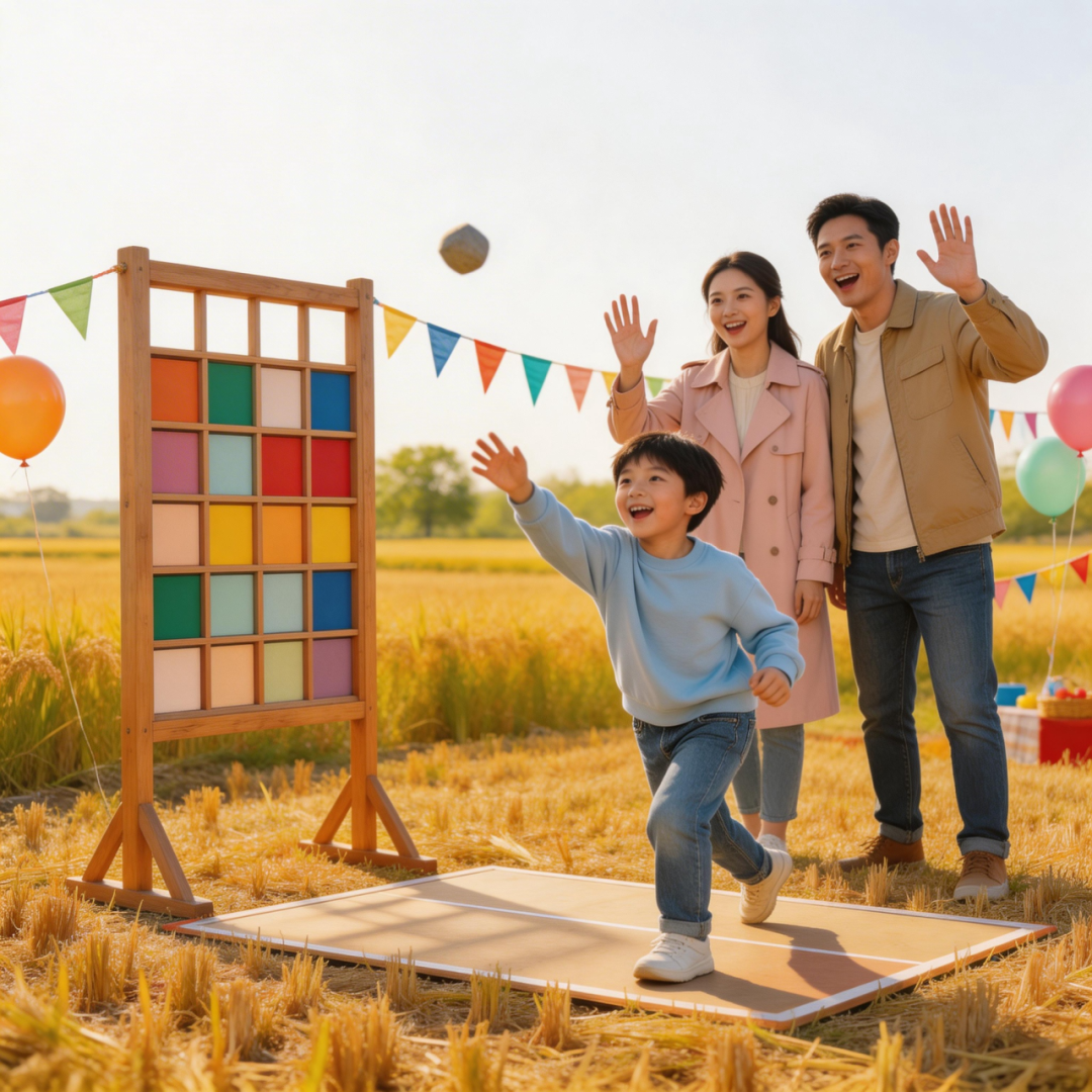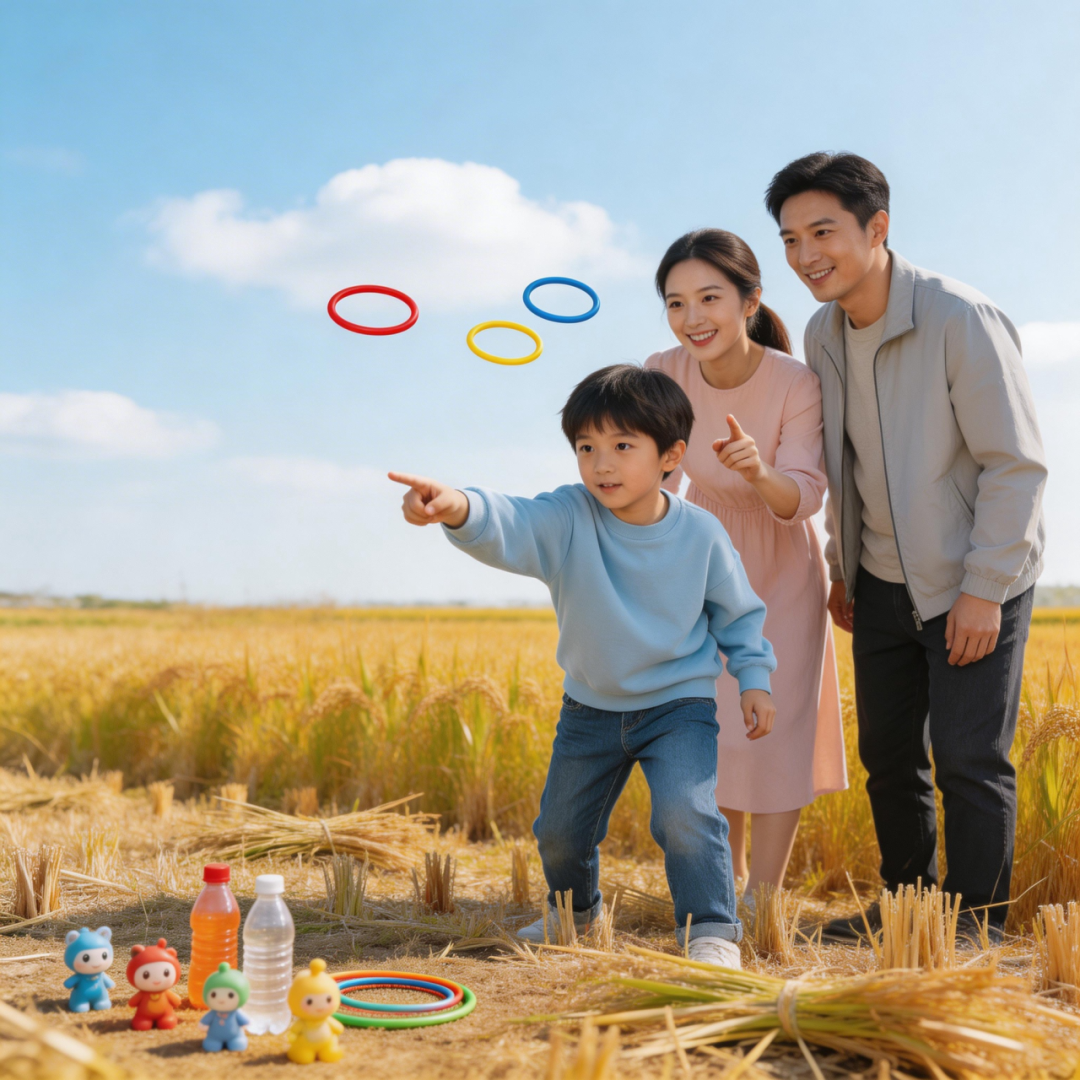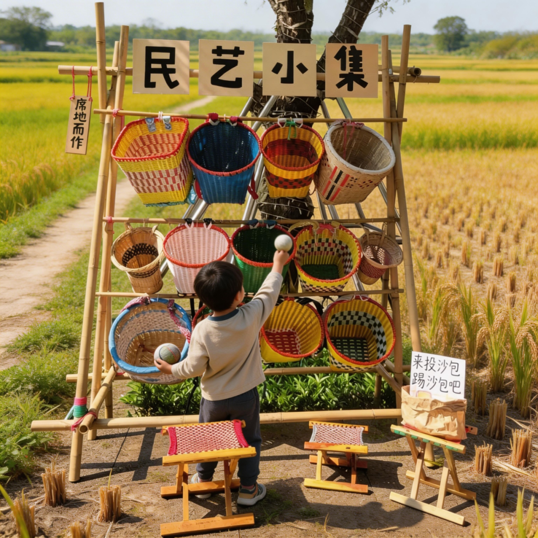 等窑鸡的间隙,别闲着。稻田边支起了一个小游园会——套圈、丢沙包、投壶、猜谜,每通关一次,就能赚到一枚“快乐币”。攒够快乐币,去小集市换礼物:种子盲盒、时令蔬菜、三元农场自产大米、伴手礼包……
