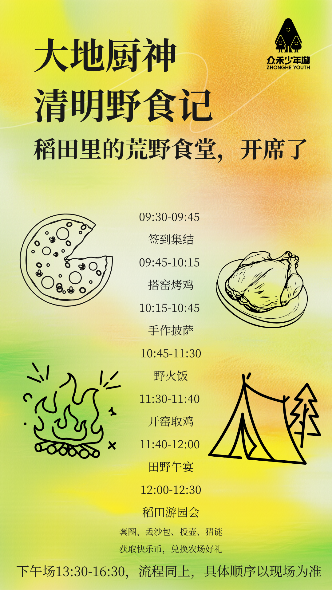 活动包含:导师费用、场地费用、活动物料、场地保险、活动组织、烤鸡1只、披萨1份、野火饭1锅(自助操作)、快乐币兑换农产品或小礼物。