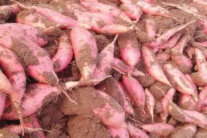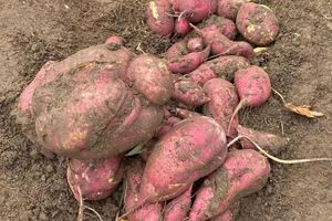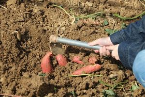 割掉多余的茎叶后,犁过地,轻轻挖开最表层的土壤,终于寻得红薯的踪迹!顺藤摸瓜,把红薯从地底挖出来~
