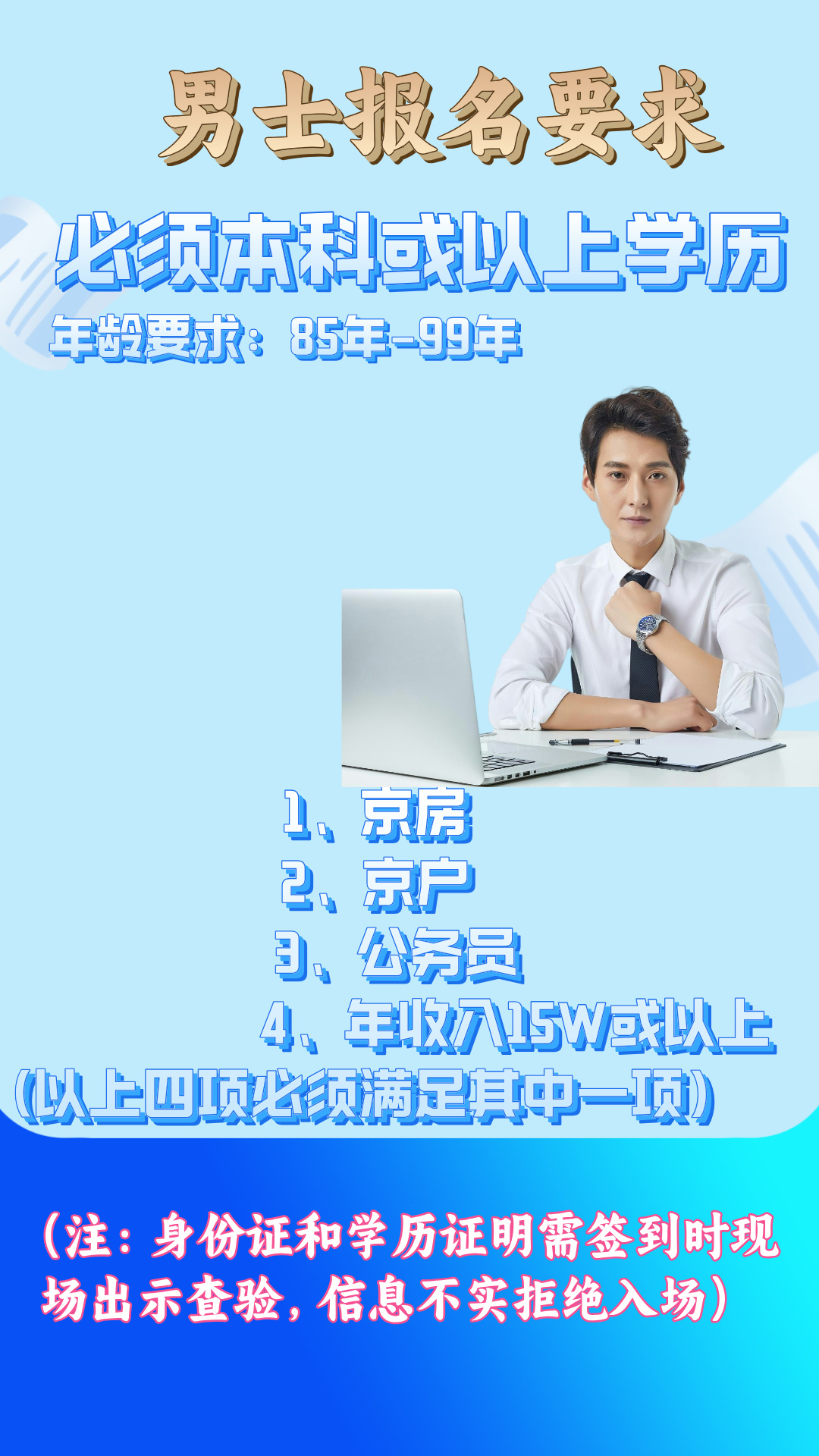 ②、【男士报名要求】基础要求:单身 | 85-99 年生| 本科 + 学历(需至少足其中一项): 京户 or京房 or 年薪 15w+ or 公务员;