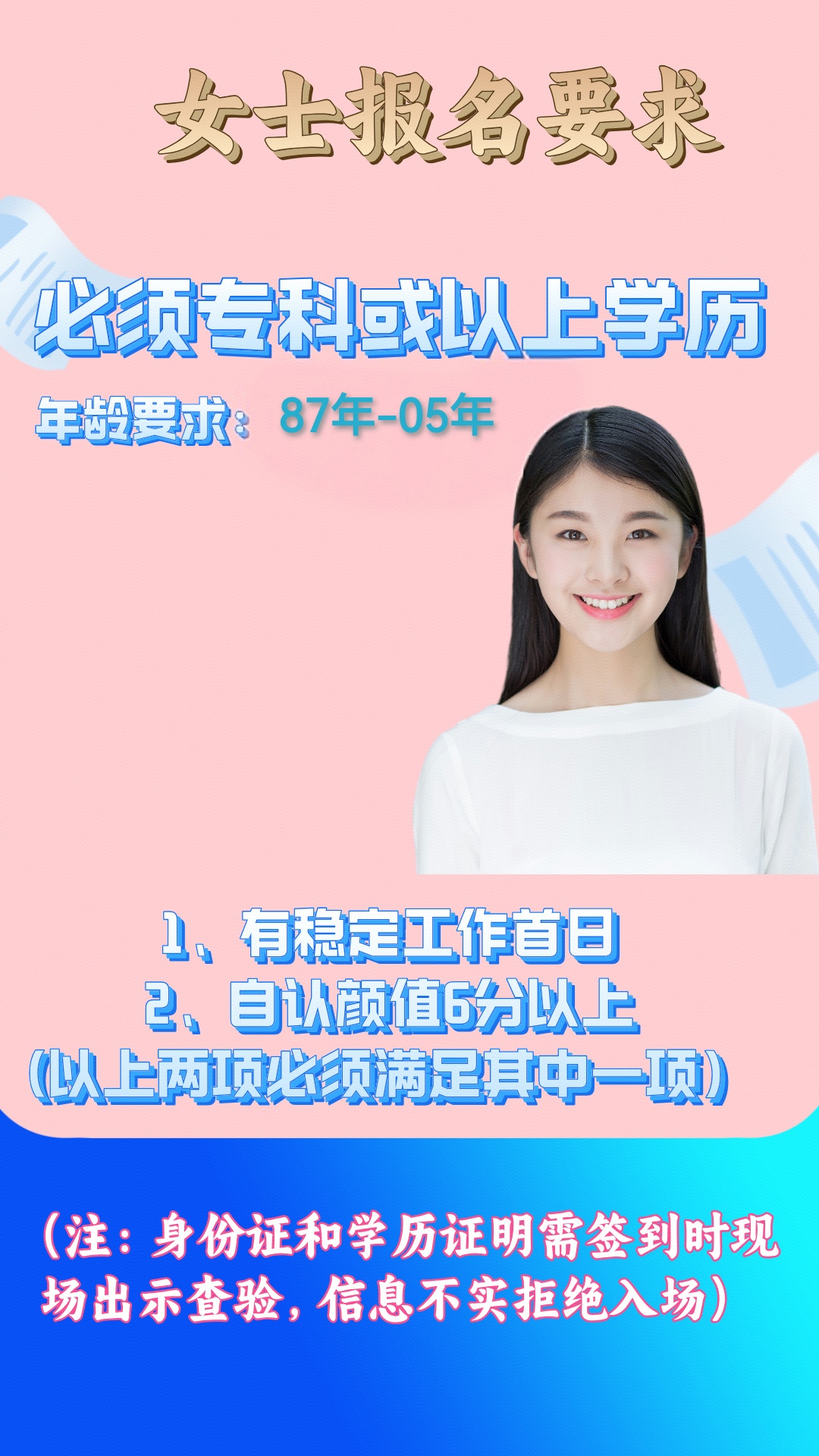 【女士报名要求】基础要求:单身 | 87-03年生 | 专科 + 学历 (需至少足其中一项):有稳定工作 or 颜值6分以上