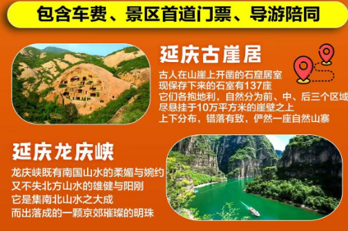 早上7:00左右(三环集合)集合出发延庆 9:00左右抵达【古崖居】(含景区首到大门票)。他位于位于北京市延庆区张山营镇峡谷中,是北京规模最大的古代洞窟聚落遗址,现存117-137个唐代至元代开凿的石室。这些石室呈蜂窝状分布于30米高的崖壁上,内部凿有炕台、灶台等生活设施,布局错落有致,展现了古代先民精湛的建筑技艺。其开凿民族与用途至今成谜,推测为西奚族聚居地,被誉为“中华第一谜宫”。 12:00左右游玩【龙庆峡】,中午午餐(餐食自理)。 龙庆峡(含景区首到大门票,推荐游玩龙庆峡游船100元(自愿自理))位于北京市延庆区,距城区85公里,被誉为"北京小漓江"。峡谷长约7公里,水面海拔570米,融合南方山水的秀丽与北方山水的雄浑。主要景点包括镇山如来、凤冠岛等30余处奇观,拥有亚洲第一的258米腾龙电梯。这里曾是辽、金、元皇家避暑行宫,冬季冰灯艺术节自1987年延续至今。夏季平均气温比市区低6℃,是京郊避暑胜地和4A级景区 | ||||||||