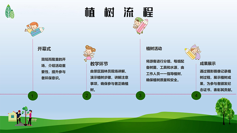 工作人员/领队给大家讲解植树节的来历、植树与环保、宣读植绿口号、学习植树方法,之后领取铁锹、水桶等植绿工具,领一株专属于你的小树苗,前往专属植树区,挖坑、放苗、填土、浇水、修剪…大家开始亲手种下希望的树苗,在心愿卡上写下你的祝福吧,合影留念,共存一份宝贵回忆……