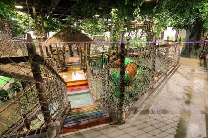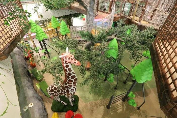 一层为雨林大厅,孩子们反复的登梯、爬高、再沿着旋转滑梯滑下,玩得不亦乐乎。