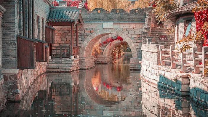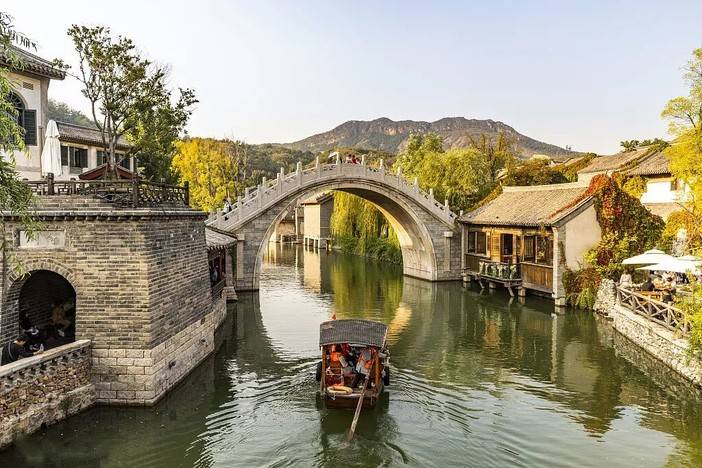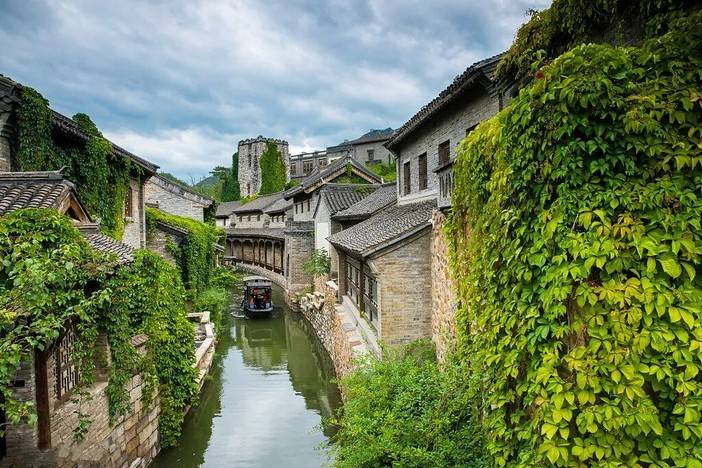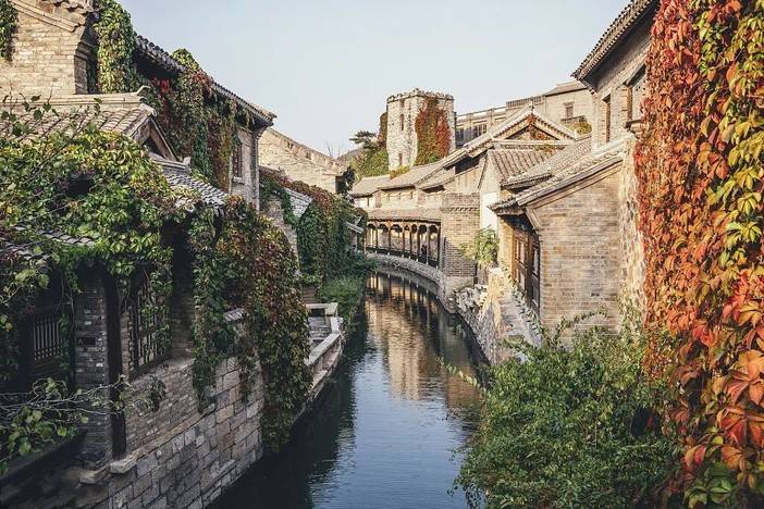蜿蜒的河流穿过建筑群,小船悠悠飘荡其中,演绎出江南水乡特有的细腻柔美。相比于江南的白墙黛瓦,古北水镇选择了大面积的灰色系建筑,采取北方建筑元素,将南北审美杂糅在一起,南来北往客都能在这里寻找到熟悉的味道,却又稍有不同,这种差异感让古北水镇热度一度飙升,成为当年首屈一指的网红打卡地。