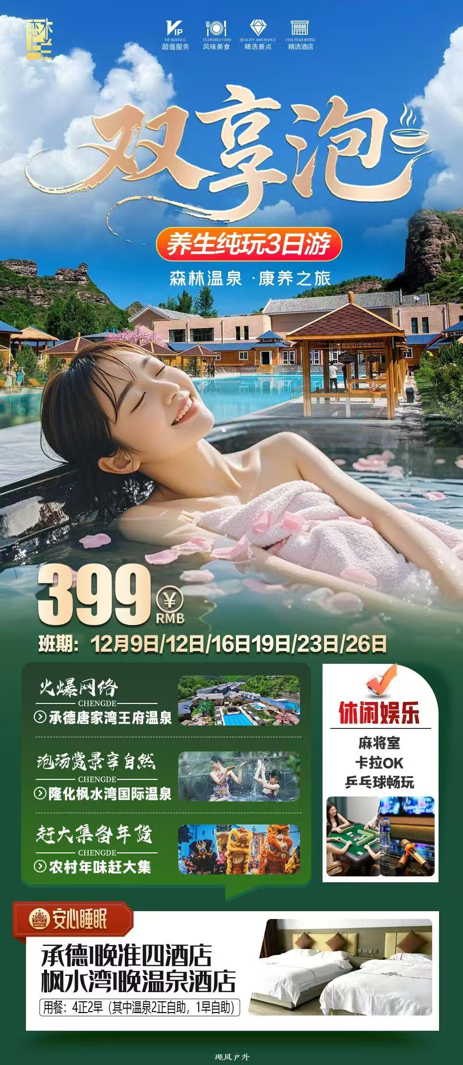 D2日 | 早餐后赶大集,之后前往七家温泉之枫水湾森林温泉城,世外桃源 冬季养生好去处,地处燕山山脉北端,承德隆化县城东北部,武烈河畔,因地热面积大、水温高、水质好而著称,水洁无味,而且含有43种对人体有益的矿物质及微量元素,是华北海拔最高的磁化温泉,水温高达98度,国内罕见,凤毛麟角。用温泉水洗浴具有美容、护肤、消炎、散瘀、软化血管等独特疗效。承德枫水湾温泉占地1250亩,建筑面积10余万平方米,按国家AAAA级旅游景区标准建设,突出上善若水的温泉文化,建筑再现康乾盛世之景象。温泉城宛若一柄如意镶嵌在碧水青山中,打造“华北第一,华夏独秀”的大型温泉国际广场,按五星级标准建设温泉大酒店,日接待量1200人,新派中式风格的温泉住宅,独具特色山体休闲健身项目,是集温泉养生、生态旅游、会议住宿、餐饮娱乐、休闲度假于一体的综合性四季旅游度假胜地。 | 早中晚 | 枫水湾温泉城 |