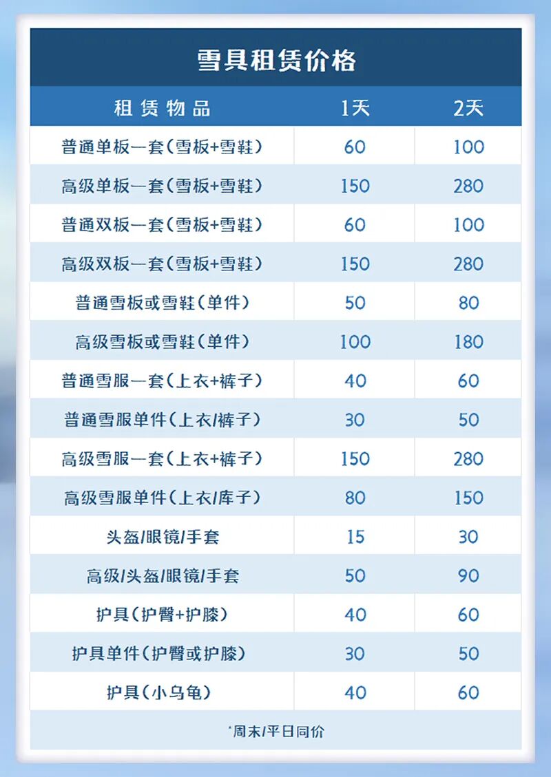 3)雪板雪鞋等雪具不含,可代为租赁,雪具租赁团队价格(崇礼城区店内租用)