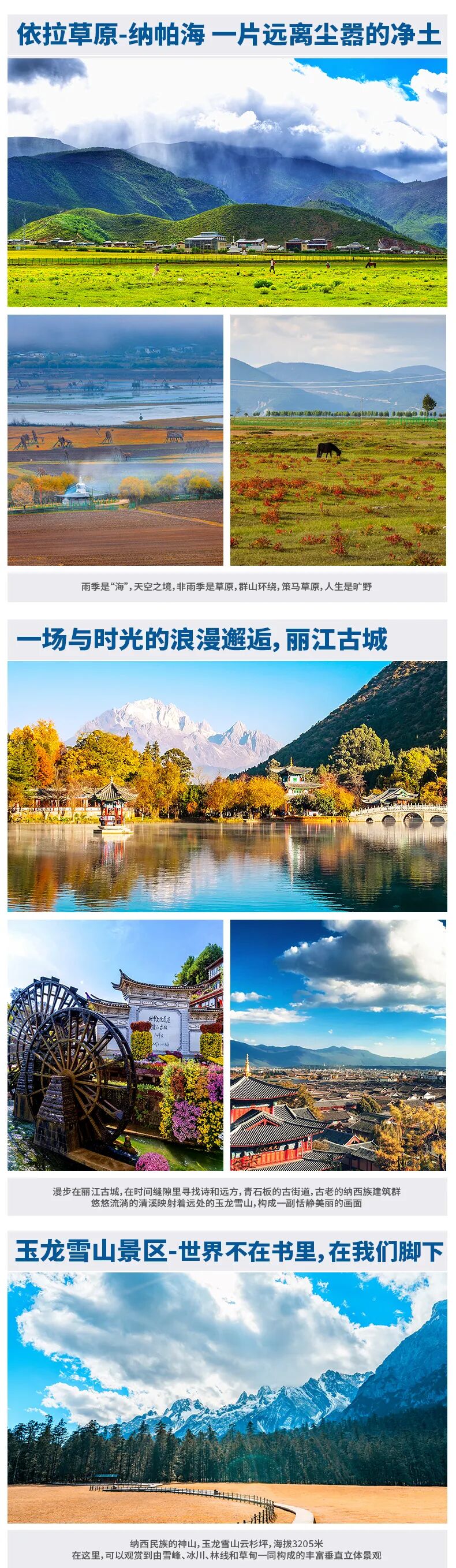 3、门票:行程内所列景点门票(玉龙雪山景区+蓝月谷套票、云杉坪索道+索道环保车、虎跳峡门票、普达措国家公园+景区环保车、泸沽湖门票);