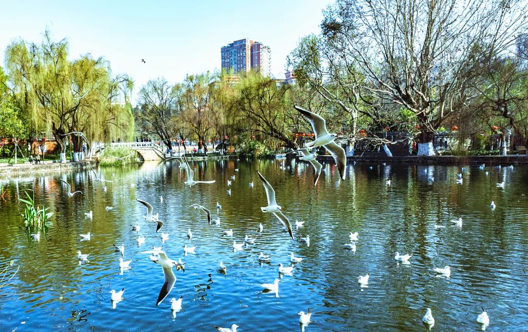 4、滇池海埂大坝,观景长廊,以开阔的湖景、壮观的红嘴鸥群和西山“睡美人”山景闻名,每年11月至次年3月,是最佳观海鸥胜地。