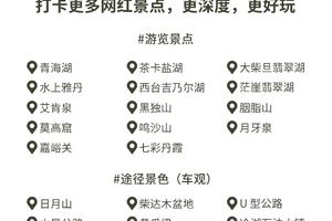 青海湖,茶卡盐湖,大柴旦翡翠湖,火星营地,翡翠湖,莫高窟,嘉峪关,七彩丹霞
