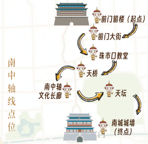 15:30-15: 55从珠市口教堂到天桥,南城中轴民俗文化带,孩子们在家长的陪同下,自由发挥,宣传中轴线并记录