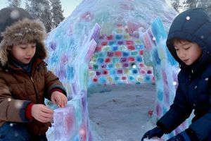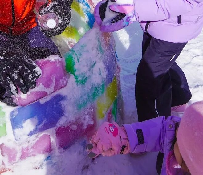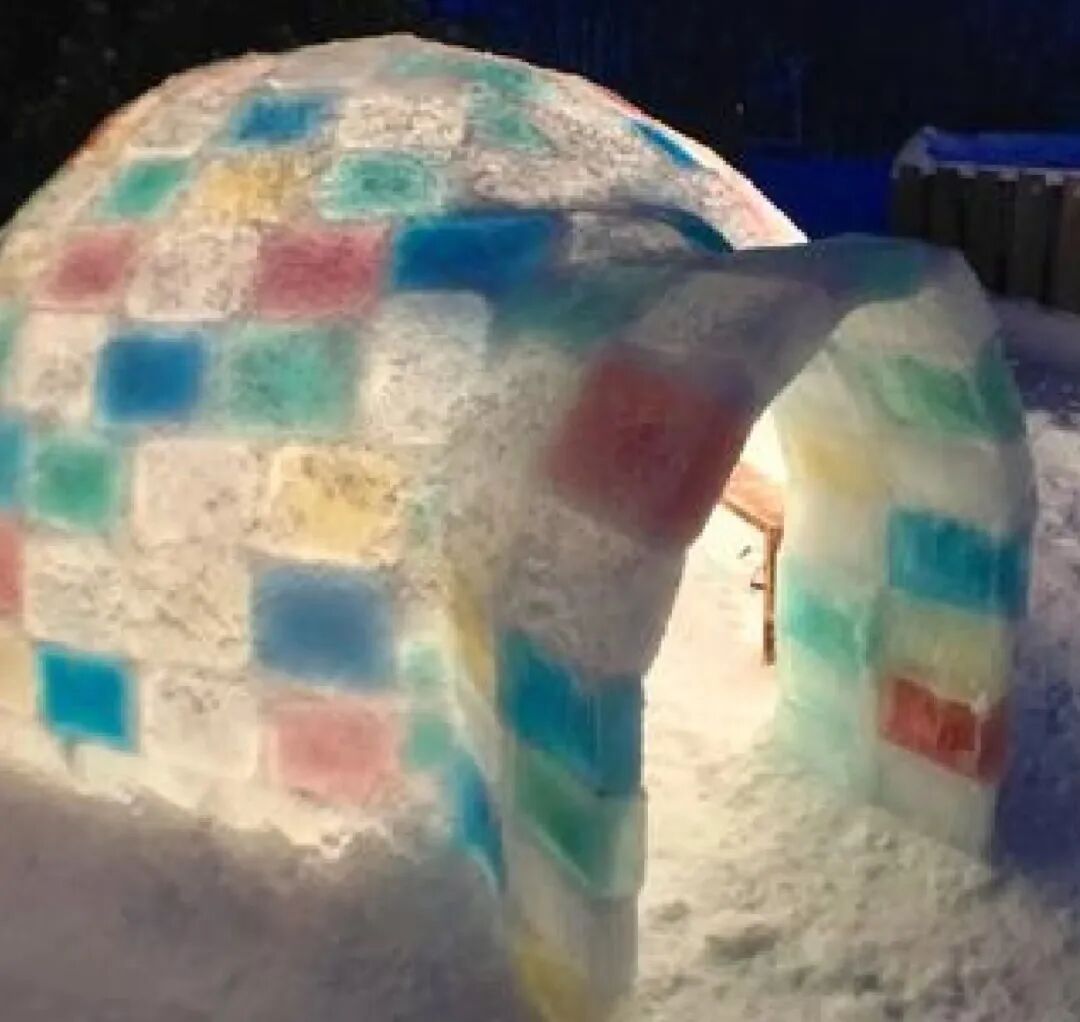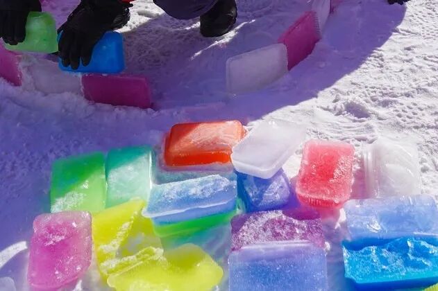 这是整个营期的高潮。孩子们将以团队形式,运用前一天制作的彩色冰砖,共同搭建一个可以真正进入的、大型的五彩冰屋。
