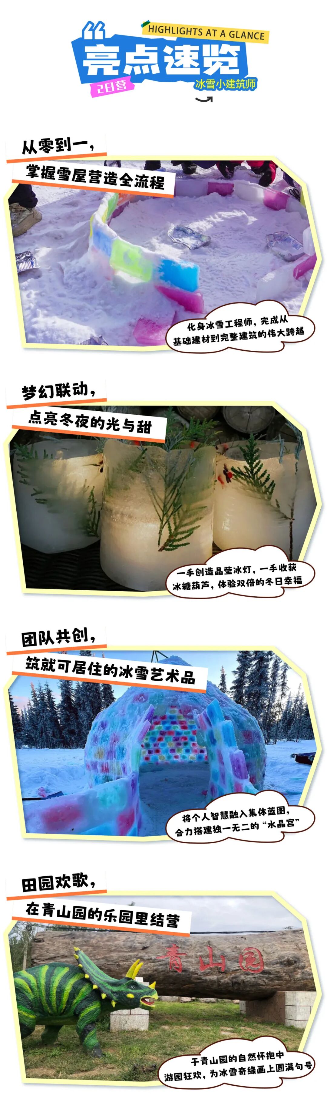 青山游园会,在自然中放松与游戏。随后举行结营仪式,总结分享,颁发 “冰雪建筑师”荣誉证书。