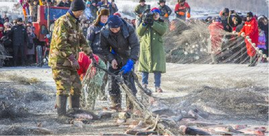 上午观摩“祭湖醒网”仪式,亲子参与冬捕实践;