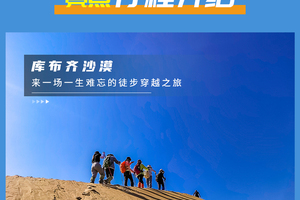 - 早上继续出发,前往中国第七大沙漠库布齐沙漠徒步。领队开始会给大家讲解沙漠徒步注意事项,到达沙漠边缘,稍适休整,之后开始第一天的沙漠穿越,今天要经过很多种地貌,沙漠行走注意补充营养、水分。在沙山中行走要求队员有更好毅力与耐力,跟紧领队的步伐。途中需翻越几座比较高沙山,中途在沙漠中的绿洲边休息、路餐,全程徒步约12公里,爬升约150米(如体力不好,也可以前往附近沙漠地质公园游览骑骆驼、玩沙地摩托等)(注:每人需准备2-3升水,午餐1份)