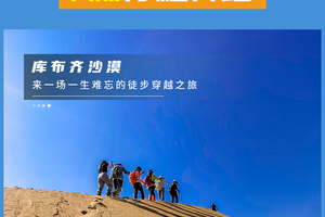 在沙山中行走要求队员有更好毅力与耐力,跟紧领队的步伐。途中需翻越几座比较高沙山,跨越穿沙公路,中途在沙漠中的绿洲边休息、路餐(注:每人需准备2-3升水,午餐1份)。*如不想徒步的朋友也可以直接前往银肯塔拉游览,体验沙漠骆驼、滑沙、沙漠缆车、沙漠越野等项目(费用自理)!