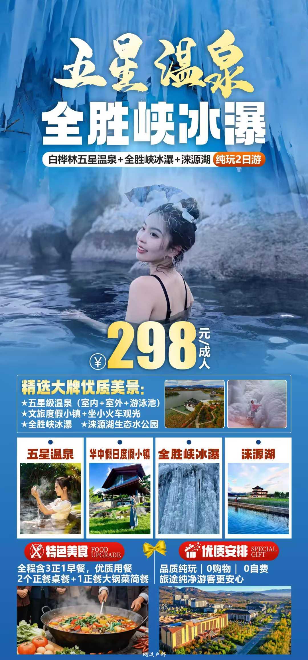 🍁白桦林五星温泉+全胜峡冰瀑+涞源湖纯玩两日游