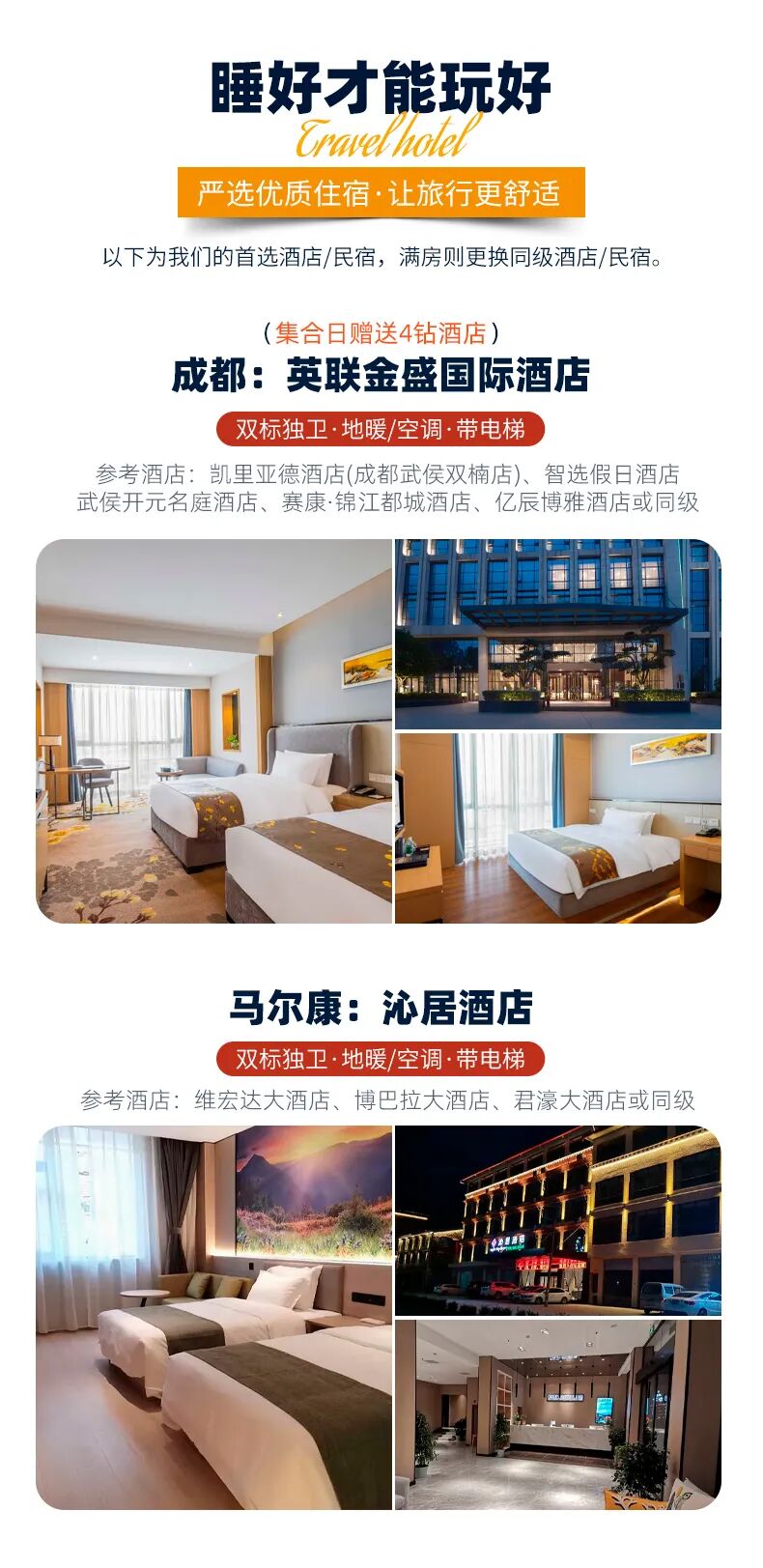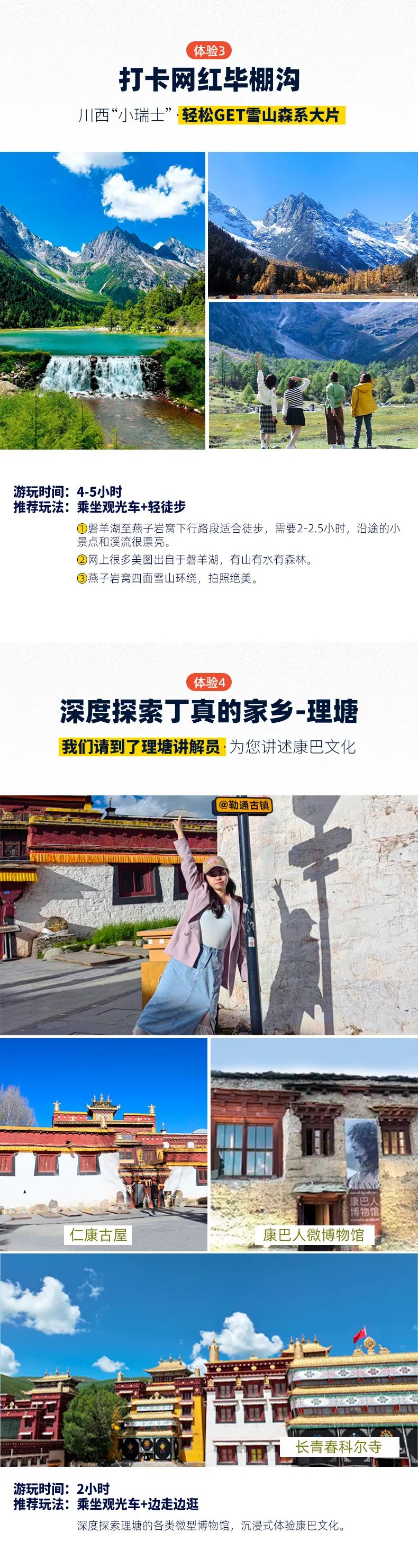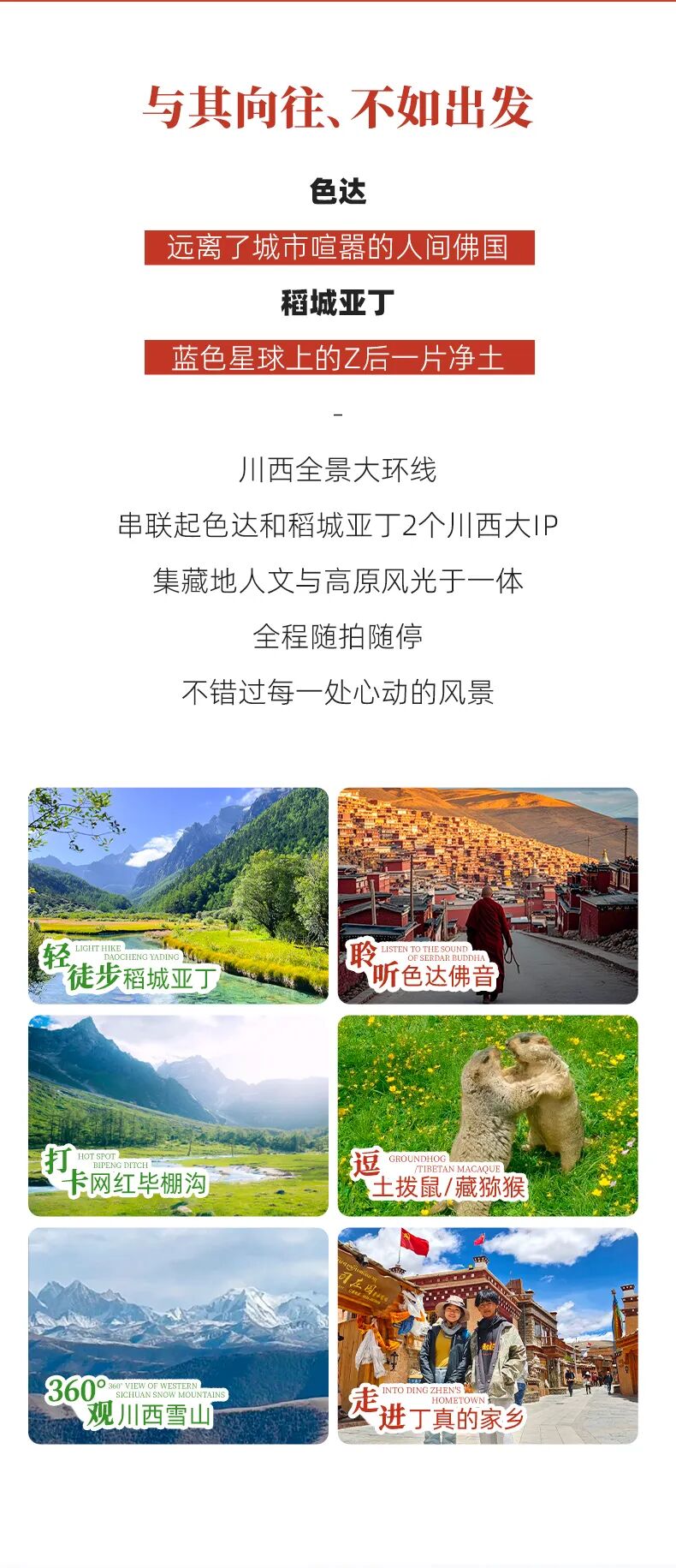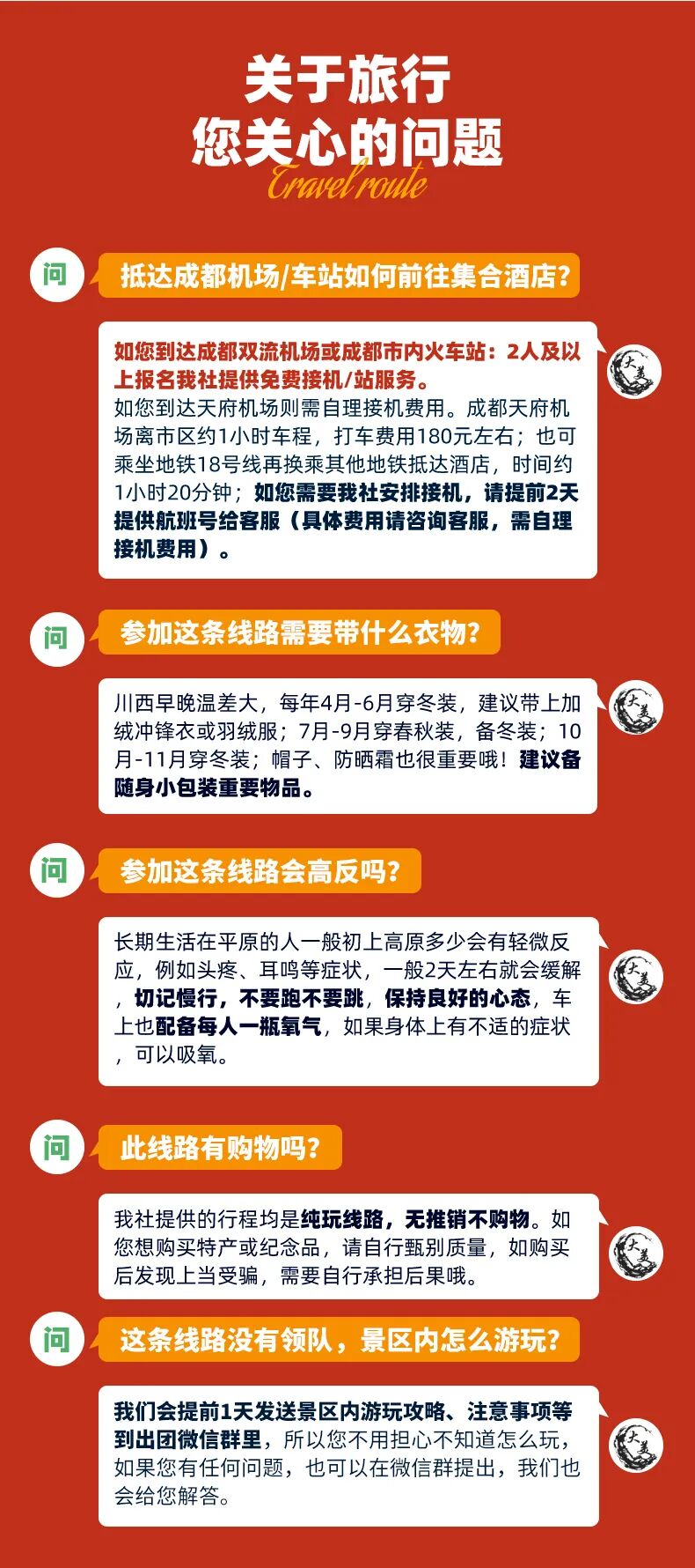 4、门票:毕棚沟观光车淡季60元/人、旺季70元/人(必须)+电瓶车20-30元/人(分段计费、可选),稻城亚丁观光车120元/人(必须)+稻城亚丁游览车70元/往返(可选),卓克基土司官寨门票60元/人(可选),色达预约48元/人,报名后请根据自己的游玩日期自行预约;