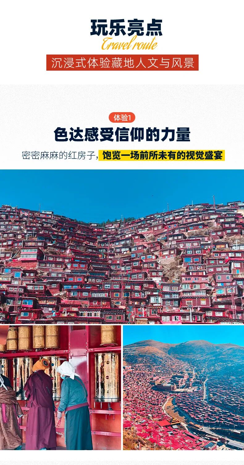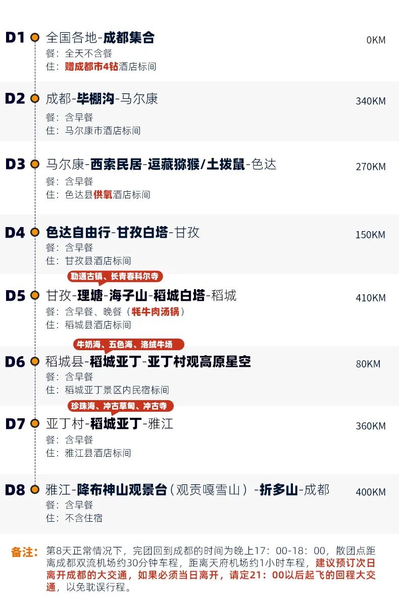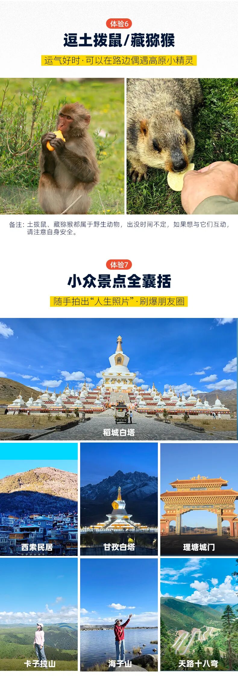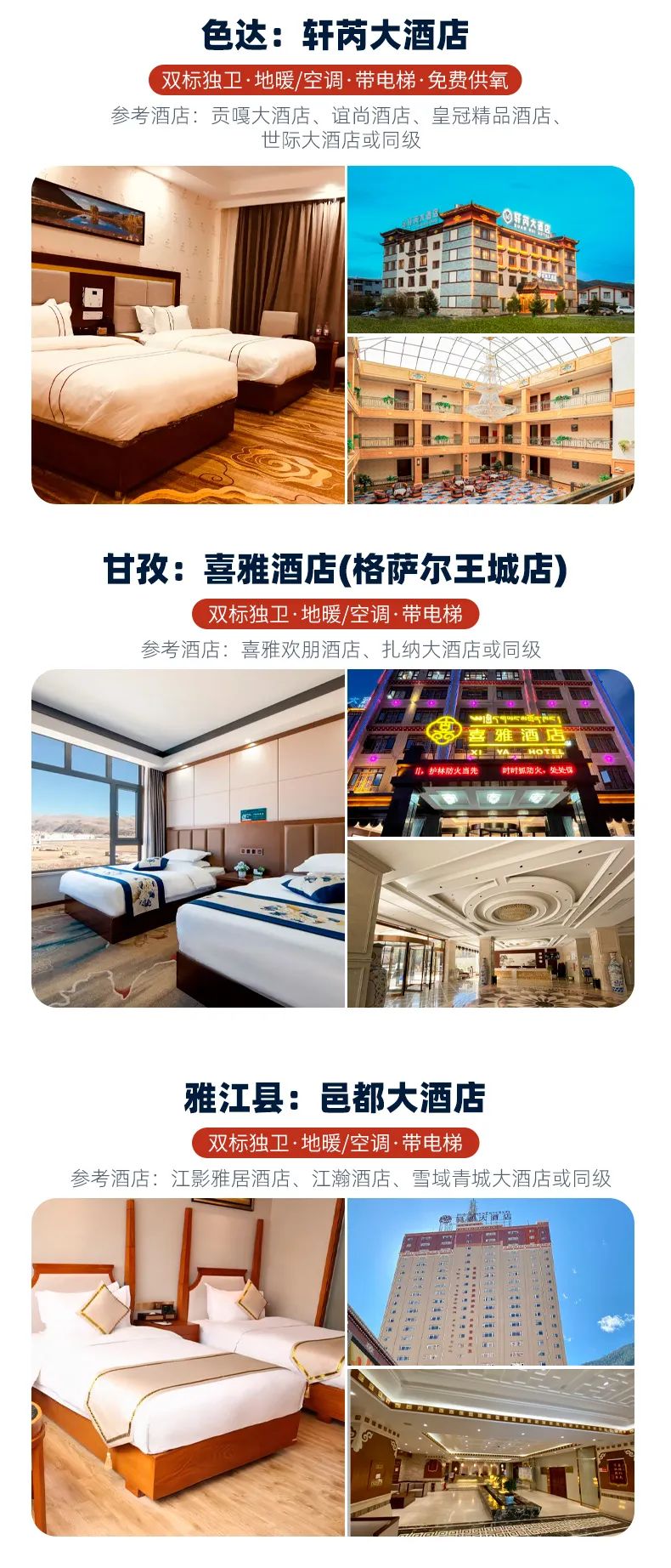 4、门票:毕棚沟观光车淡季60元/人、旺季70元/人(必须)+电瓶车20-30元/人(分段计费、可选),稻城亚丁观光车120元/人(必须)+稻城亚丁游览车70元/往返(可选),卓克基土司官寨门票60元/人(可选),色达预约48元/人,报名后请根据自己的游玩日期自行预约;