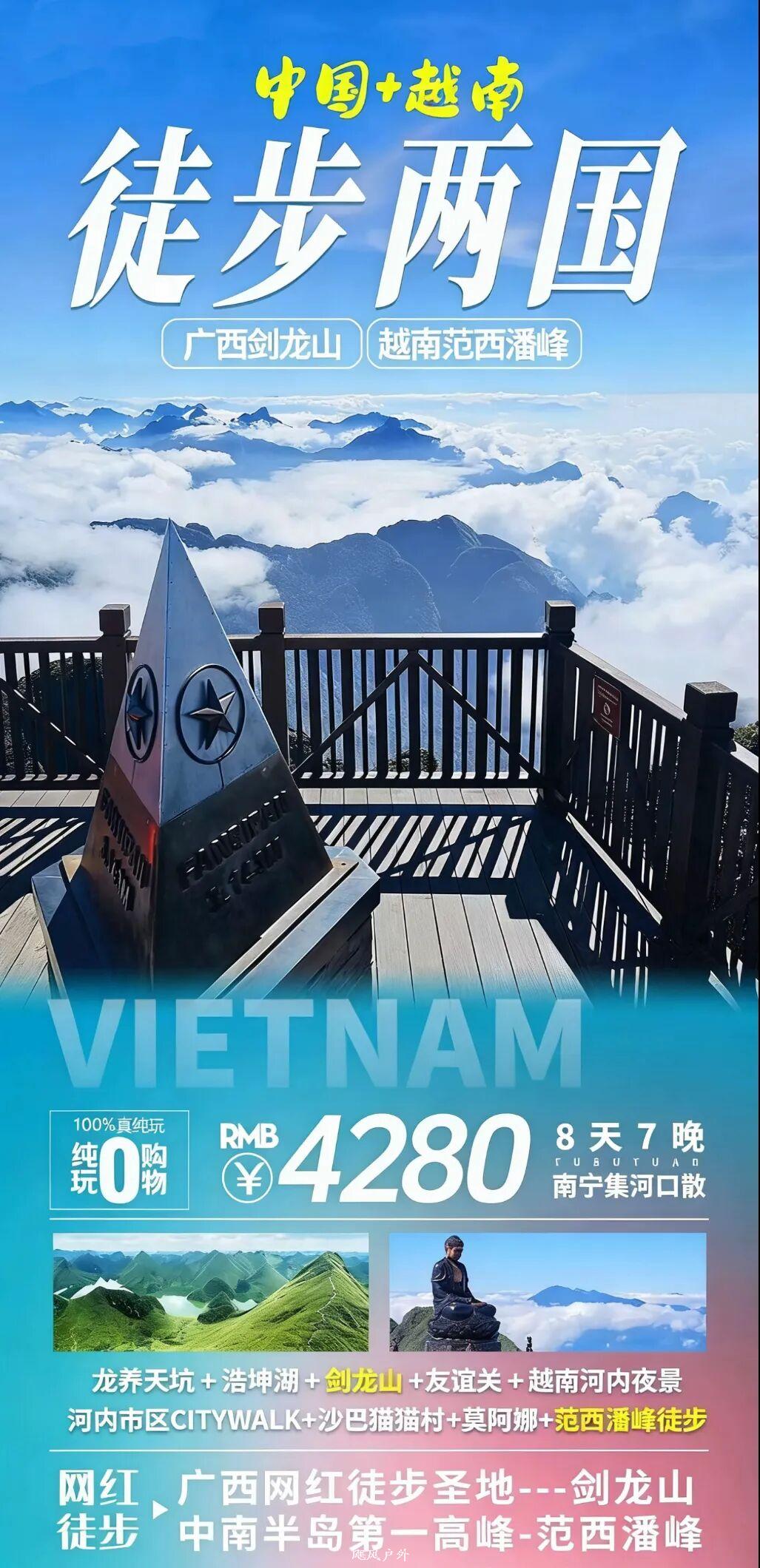 6、领队/导游:国内段1名轻户外领队服务2天,越南段1名越南当地中文导游服务5天+国内出境领队服务5天;