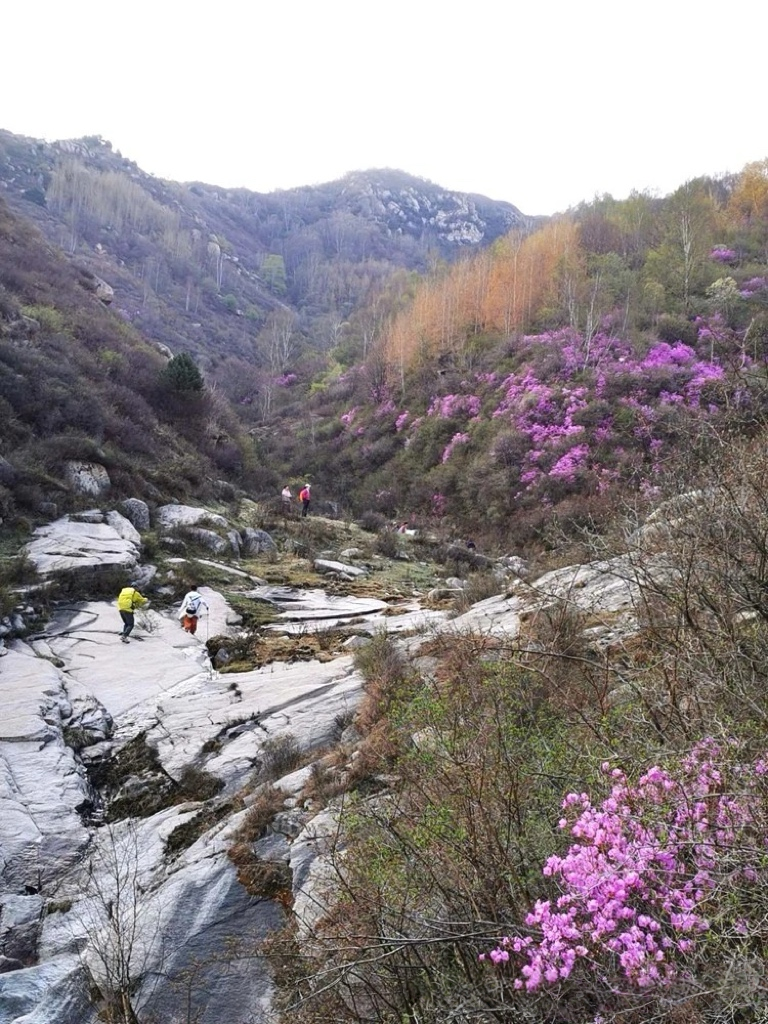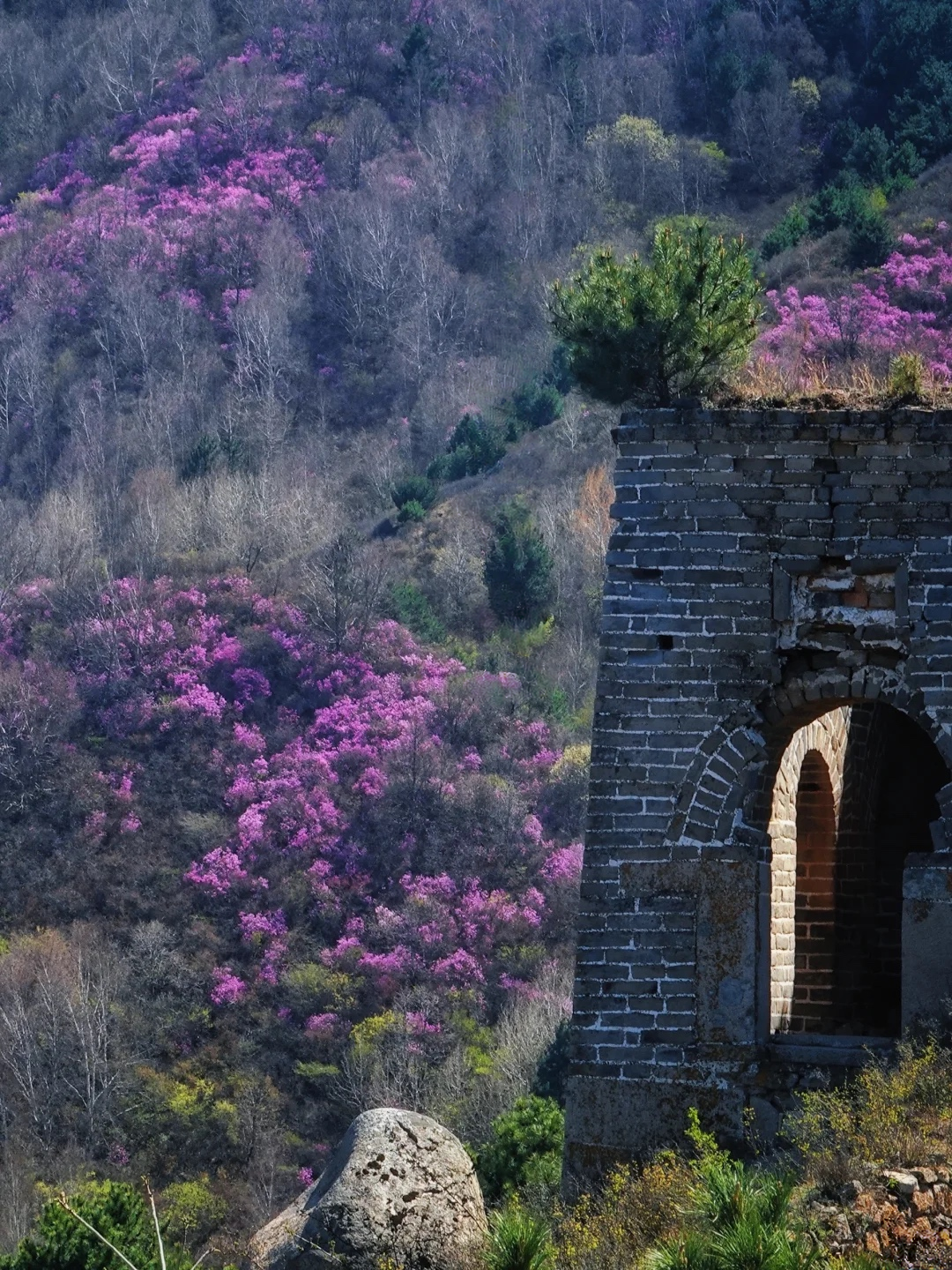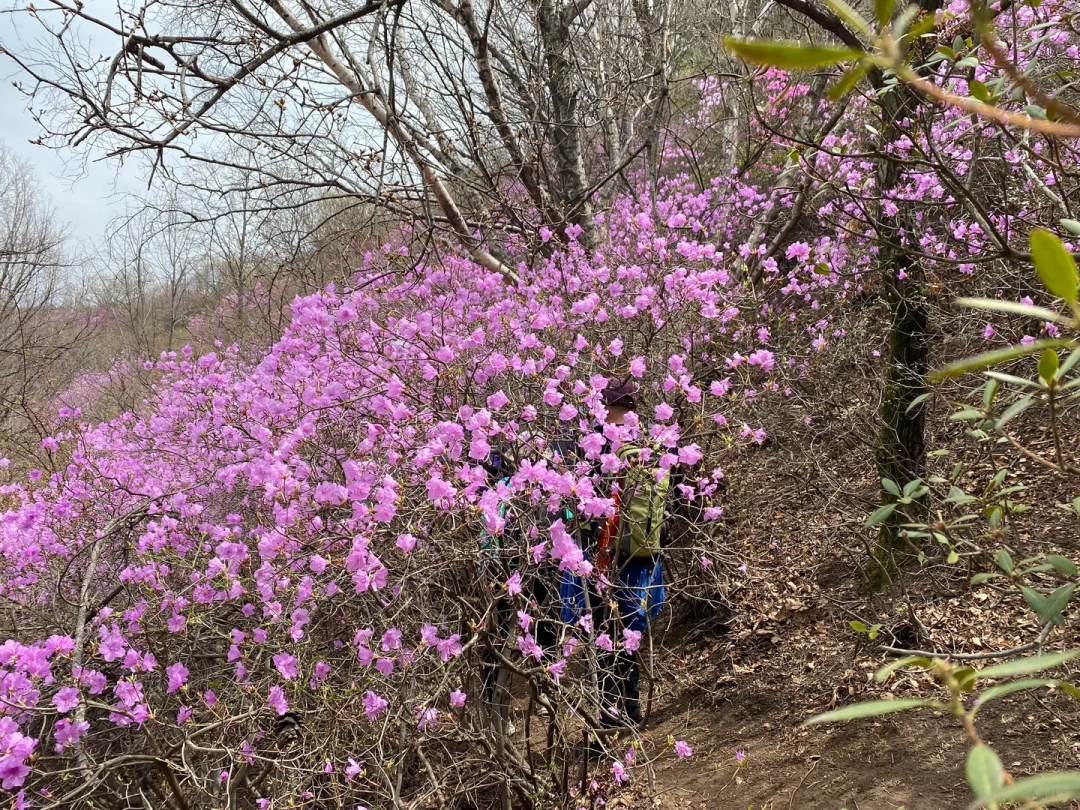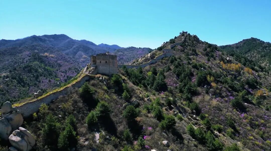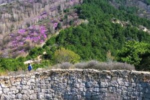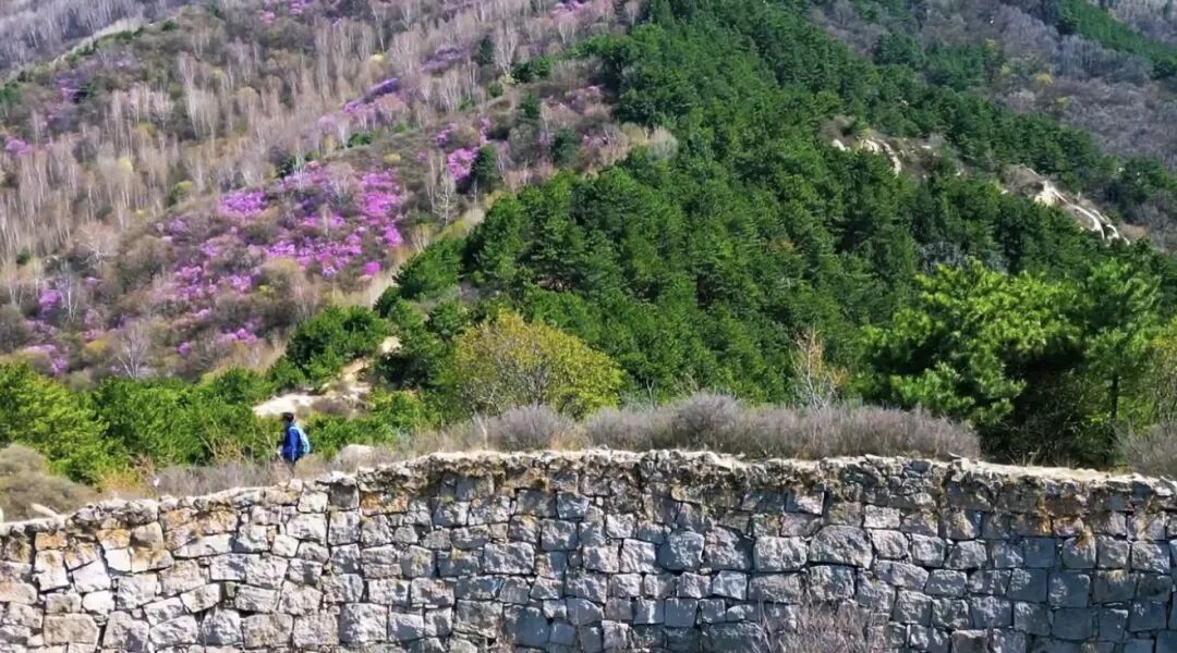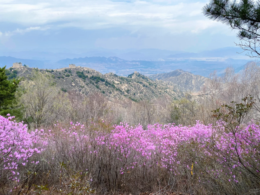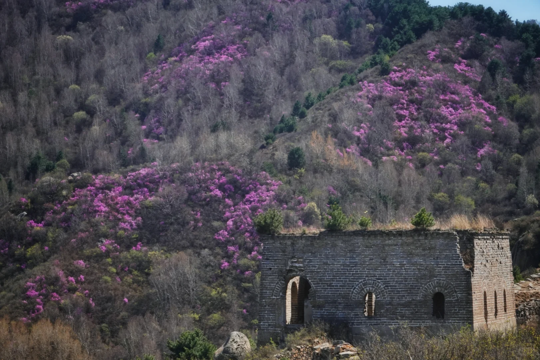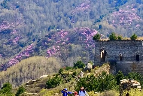 - 10:00|抵达徒步起点 整装跟随领队进山,每年四月底至五月中旬,是石窝长城的杜鹃花期。粉紫色的杜鹃花一丛丛、一簇簇地开放在山野间,它们不追求铺天盖地的阵势,而是恰到好处地点缀在巨石缝隙里、灌木丛间、长城墙根下。花瓣薄而透光,在阳光下呈现出温柔的粉紫色。漫山开遍杜鹃花,蜿蜒的长城像巨龙一样盘卧在山脊之上,红色的花丛点缀在山石之间,描绘了一幅充满北方豪情与浪漫的画卷。