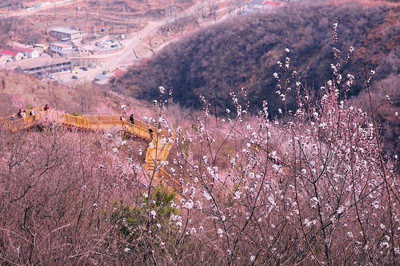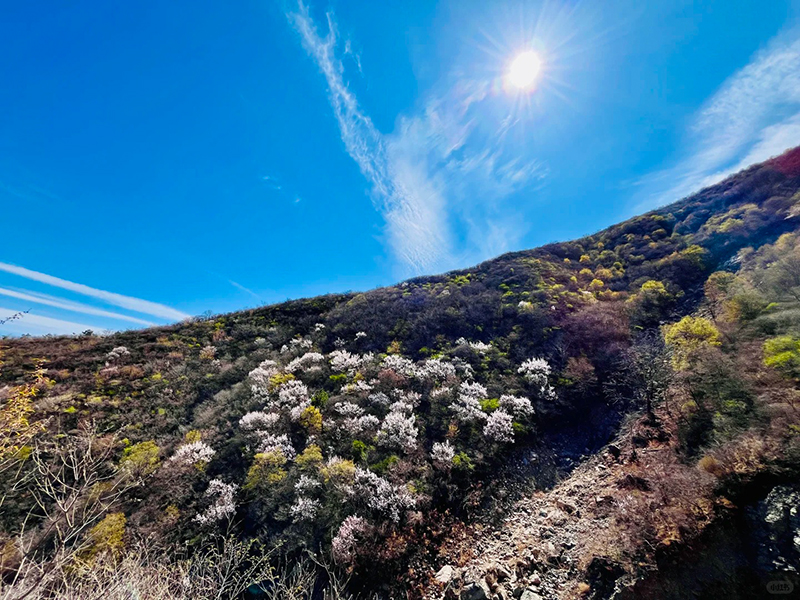 路线难度简单,适合大部分徒步爱好者。行至高处,可远眺永定河峡谷及连绵山峦,若正值桃花盛期,可见远近山坳里一片片粉白色的花团,景观层次丰富。