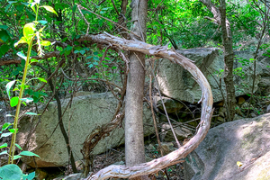 北京怀柔藤萝谷,位于九谷口风景区,这里由九个山谷会聚于此而知名,其中以藤萝谷最为有名,因为它几乎未被开发,无人工元素,纯原始景观。夏秋之季,满山沟藤萝,时有溪流和瀑布出现,山花、野果时不时映入眼帘。这里是原汁原味的大自然景观,攀爬藤蔓,有一种小时候上树的感觉。