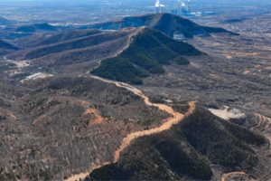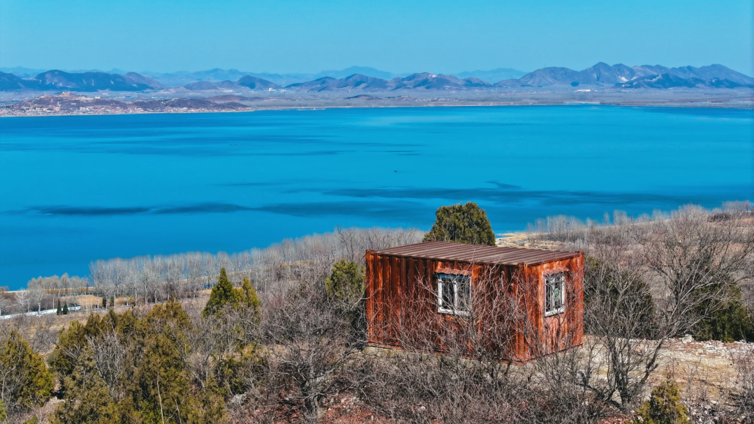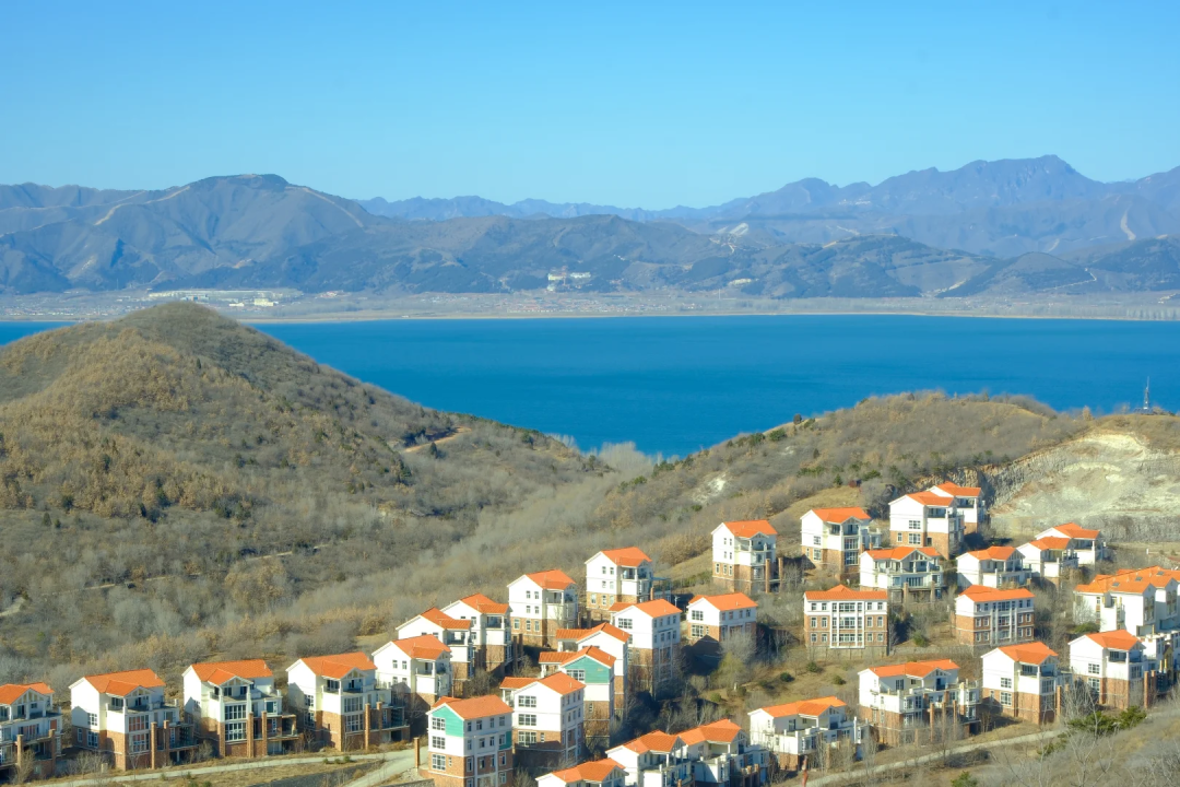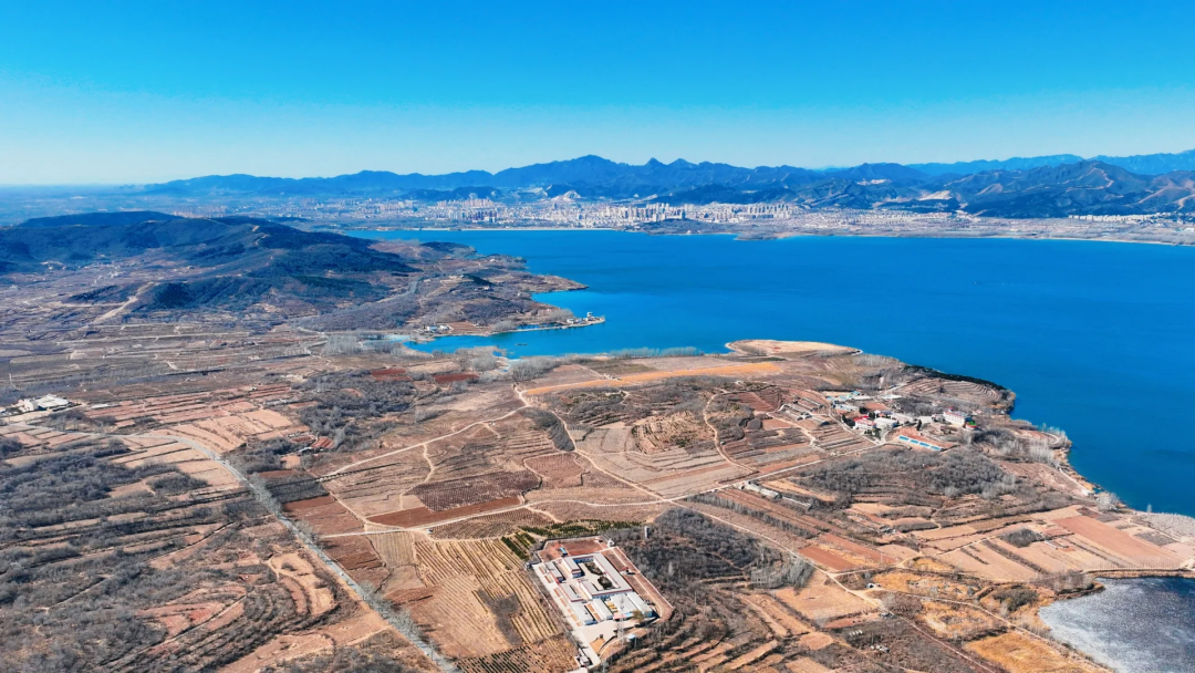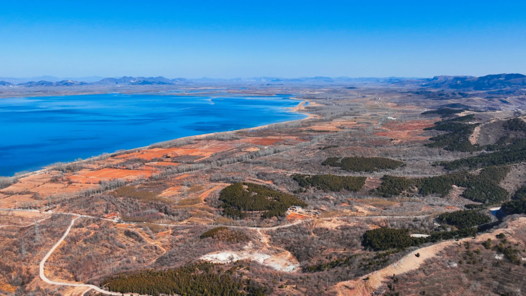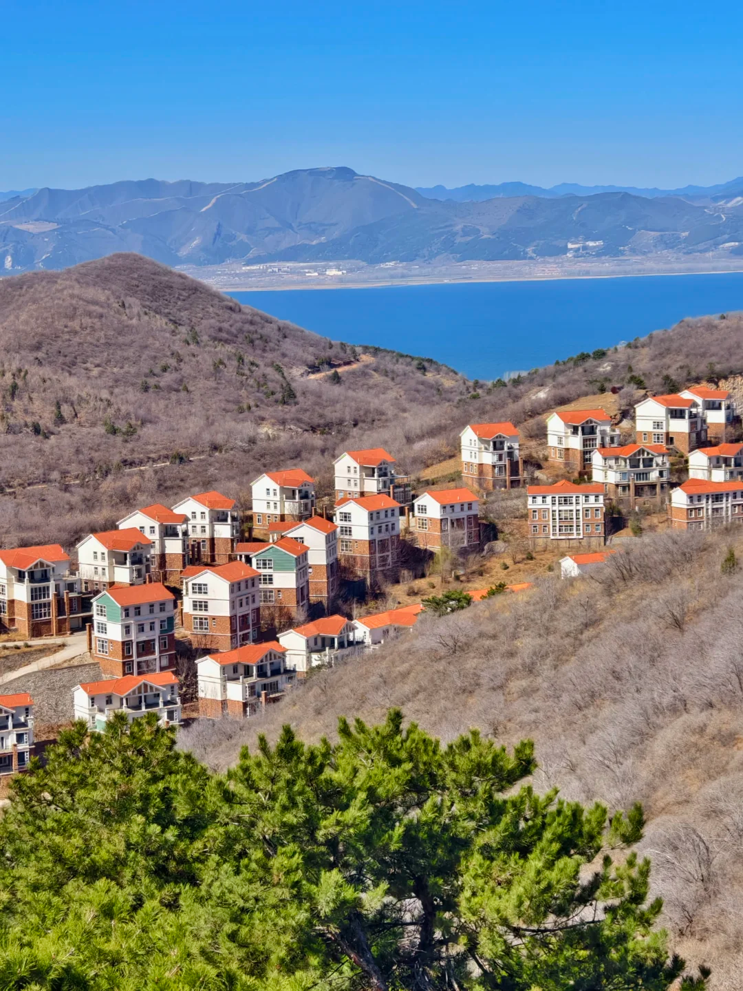 山脚碧湖如翡翠,山脊线像巨龙盘旋