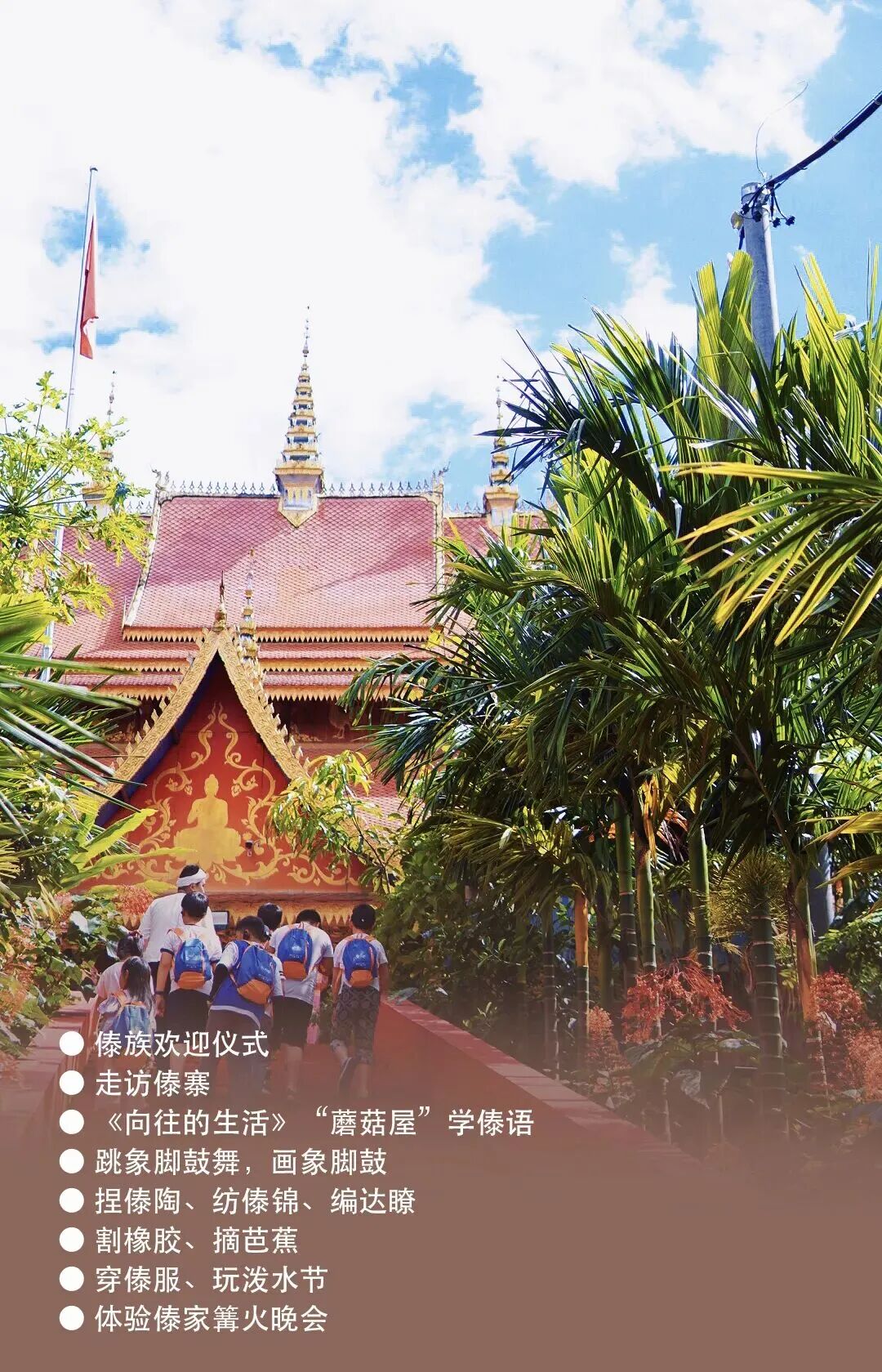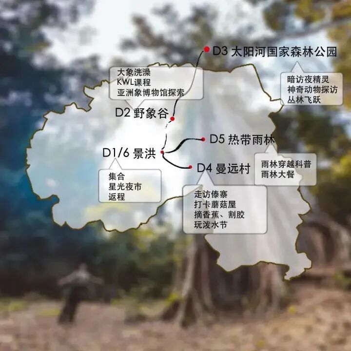 体验:野象谷为大象洗澡、KWL课堂、雨林穿越、探访曼远村、认识傣医、割胶、砍芭蕉(成人体验,小朋友不体验)、换傣族服装、泼水节、小熊猫庄园动物科普等