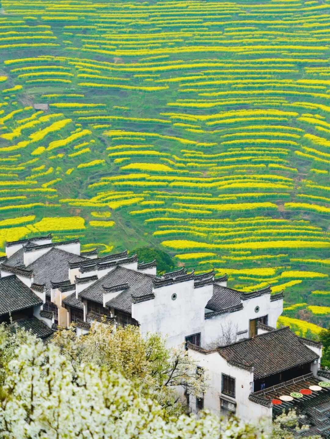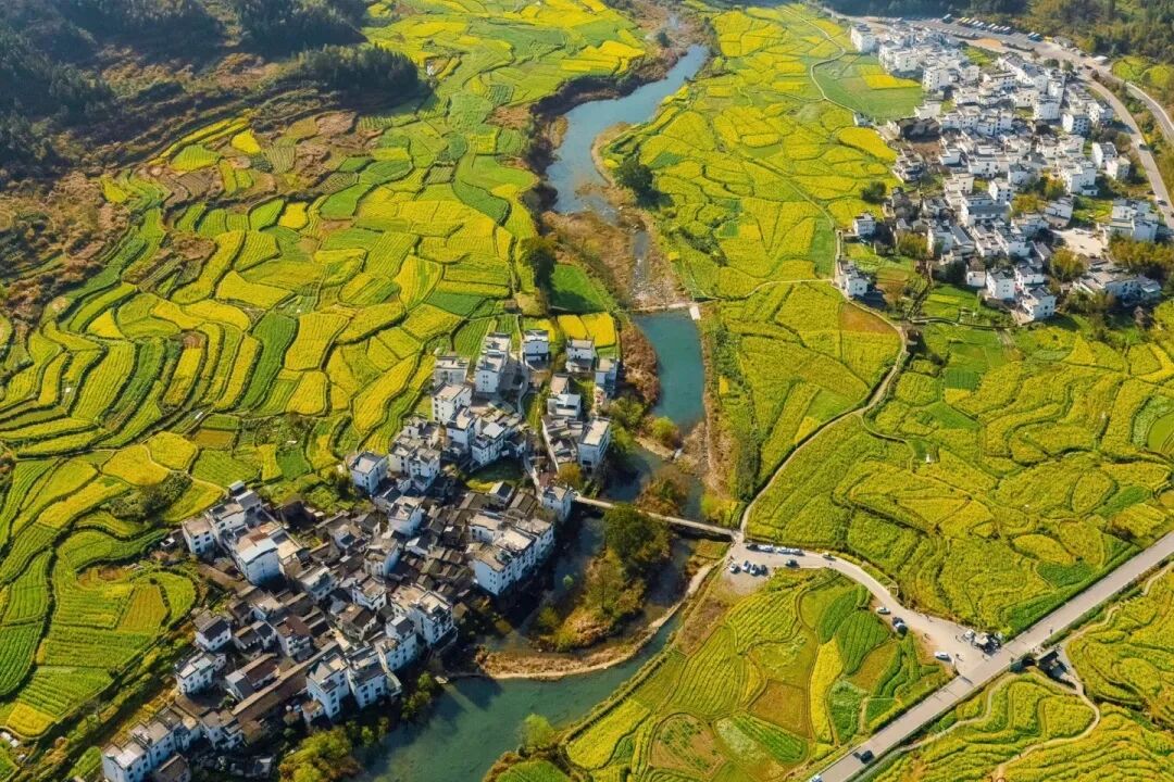 白墙黛瓦绕清溪,万亩金花叠梯田,