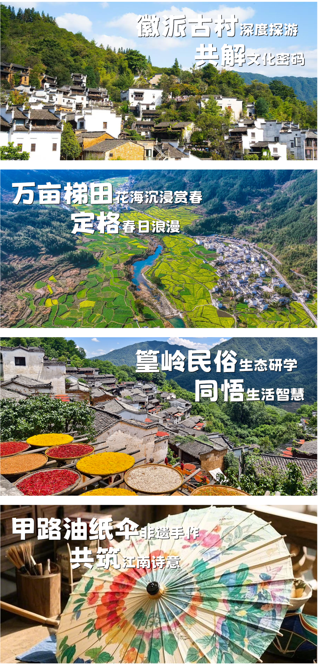 登临悬崖上的 “梯云人家” 篁岭,和孩子一起探究 “地无三尺平” 的古村如何顺应自然打造居住与耕作系统,解密晒秋民俗的地理与气候智慧,对比天街烟火与古村静逸,在观察与思考中,培养孩子的思辨能力。
