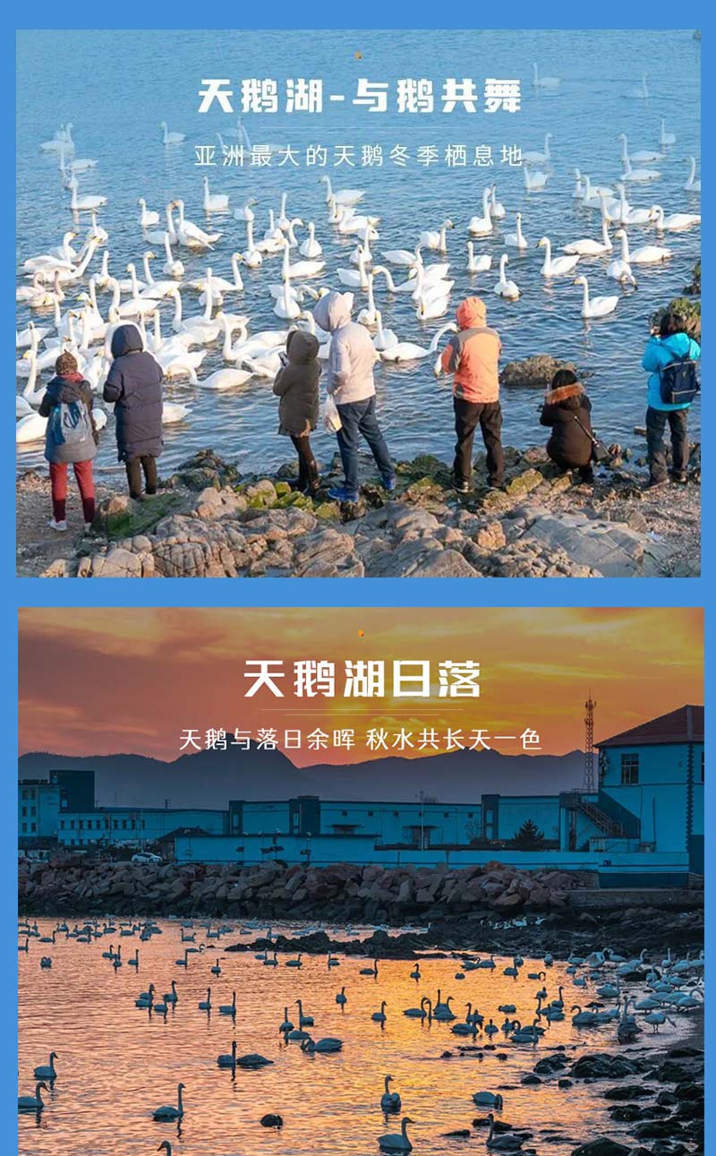 天鹅、白雪,冬季的大海别有一番美丽,整个观天鹅海岸线约3公里。您也可以自行到花斑彩石参观,花斑彩石是五亿多年前寒武纪燕山期火山喷发的火山岩。黄昏时我们在村里拍摄海草房及日落,这是所有摄影爱好者最喜欢的时段。