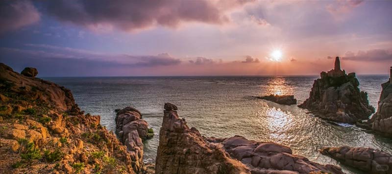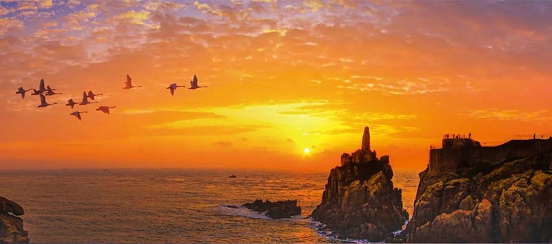 成山头又名“天尽头”,三面环海,一面接陆,与韩国隔海相望,因地处成山山脉最东端而得名。曾被《中国国家地理》评为“中国最美的八大海岸”之一,自古就被誉为“太阳启升的地方”。这里是最早看见海上日出的地方,与海南三亚的亚龙湾、台湾基隆的野柳一起名列三甲。站在观海长廊上举目望去,面前是浩瀚大海,将军石、小石林等礁石林立,风光尽收眼底。