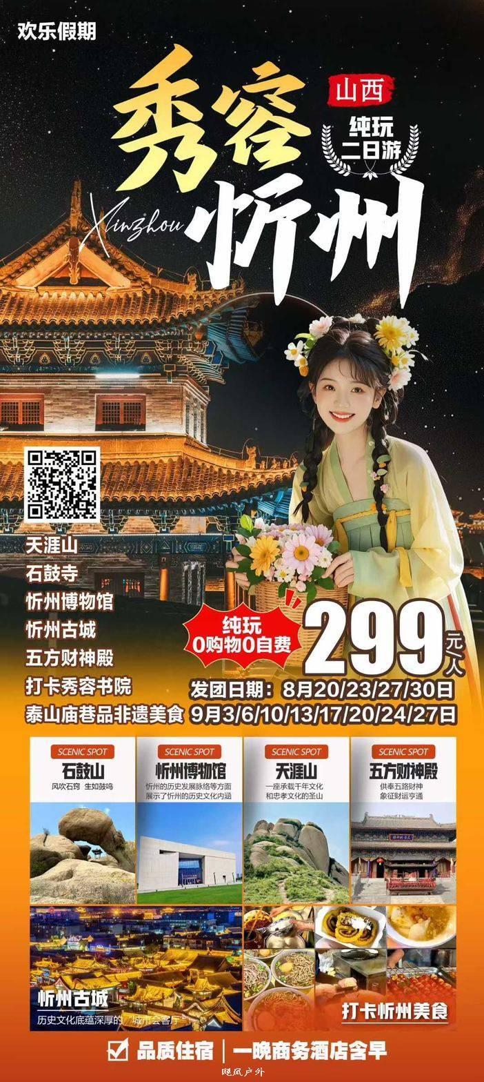 【忻州古城】。推荐线路:南门➡️明月楼➡️泰山庙➡️财神庙➡️蓝墙底巷➡️秀荣书院➡️关帝庙。晚上夜游古城、品尝美食(演出丰富精彩)。