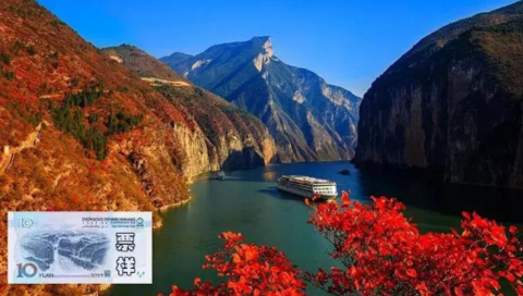 打卡十元人民币背面图案、白帝城、世界上最大水电站等