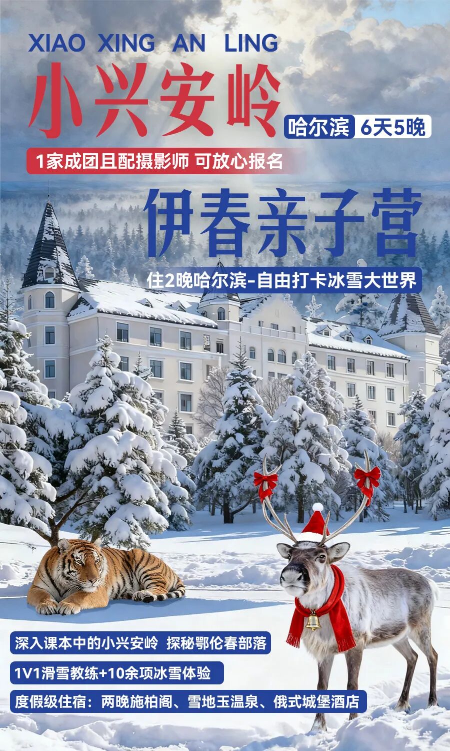 6天5晚哈尔滨·伊春亲子营,超选性价比,1家成团且配摄影师,带您从璀璨梦幻的哈尔滨冰雪大世界,到对视东北虎林园中的“森林之王”;从穿上鄂伦春族的民族服饰拍森系大片,到越野穿越小兴安岭、雪原上体验马拉爬犁、与驯鹿亲密互动,开启一场不赶场、有温度又超有趣的冰雪之旅!