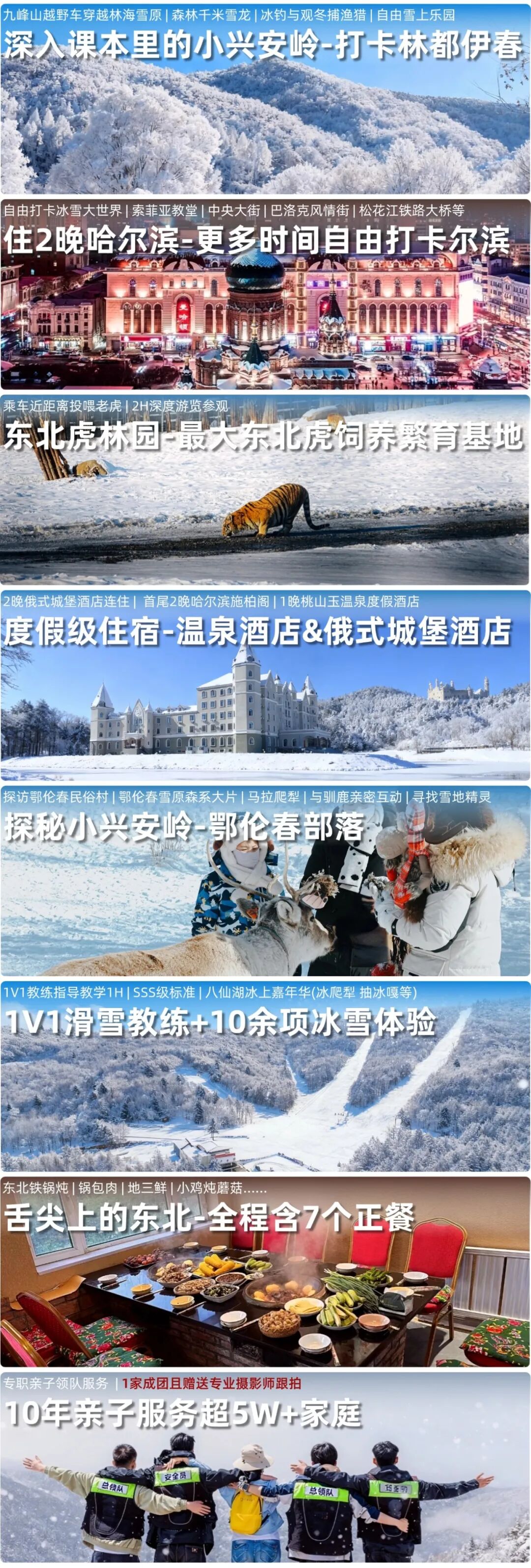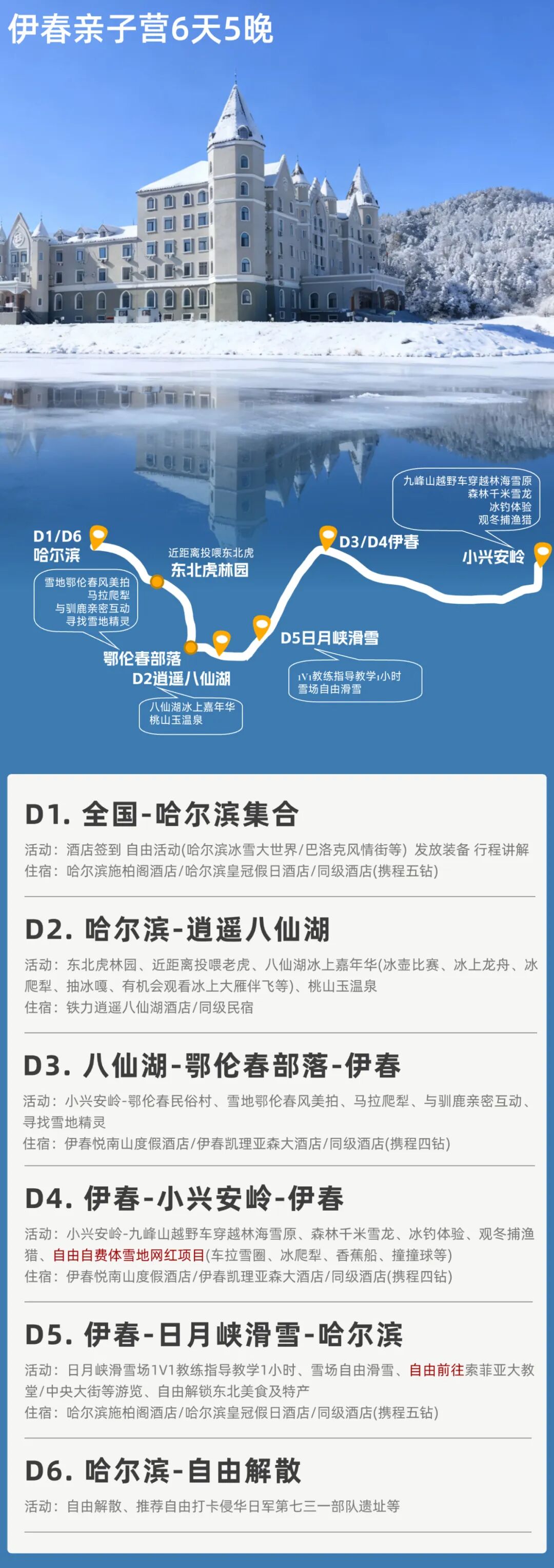 体验:逍遥八仙湖冰上嘉年华、有机会观看大雁伴飞、桃山玉温泉、鄂伦春族服饰体验、马拉爬犁、驯鹿互动和投喂、徒步寻找森林小精灵、越野车穿越林海雪原、森林千米雪龙、冰钓体验、观看冬捕渔猎、滑雪4小时+1v1滑雪教学等行程所涉及体验活动。