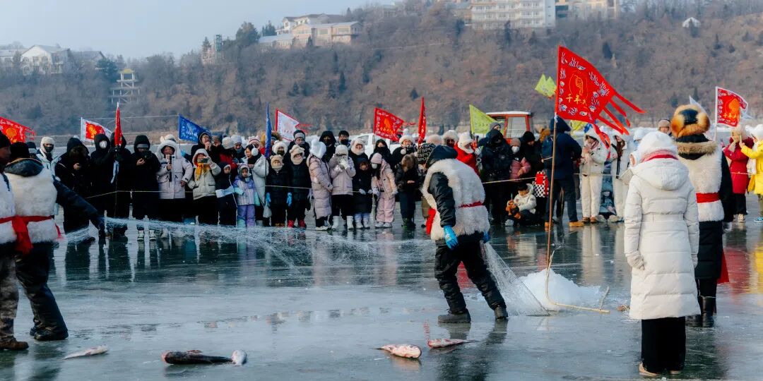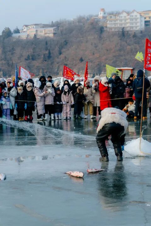在开阔湖面上围观传统渔猎,见证巨网从冰下捞起丰饶,瞬间点燃全场热情。