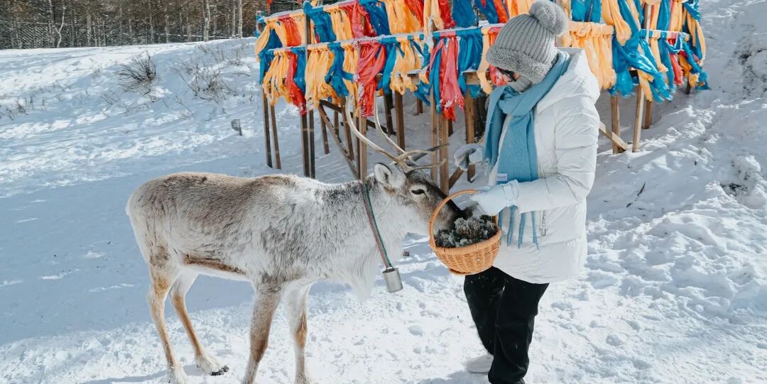 走进驯鹿的栖息地,与温顺的驯鹿亲密贴贴,你可以亲手抚摸它们茸茸的皮毛,近距离观察并投喂。