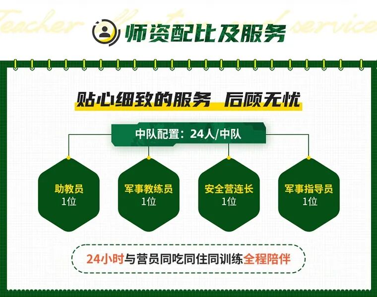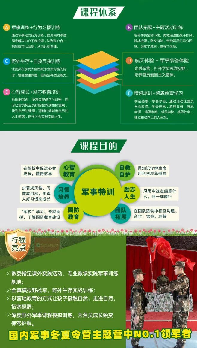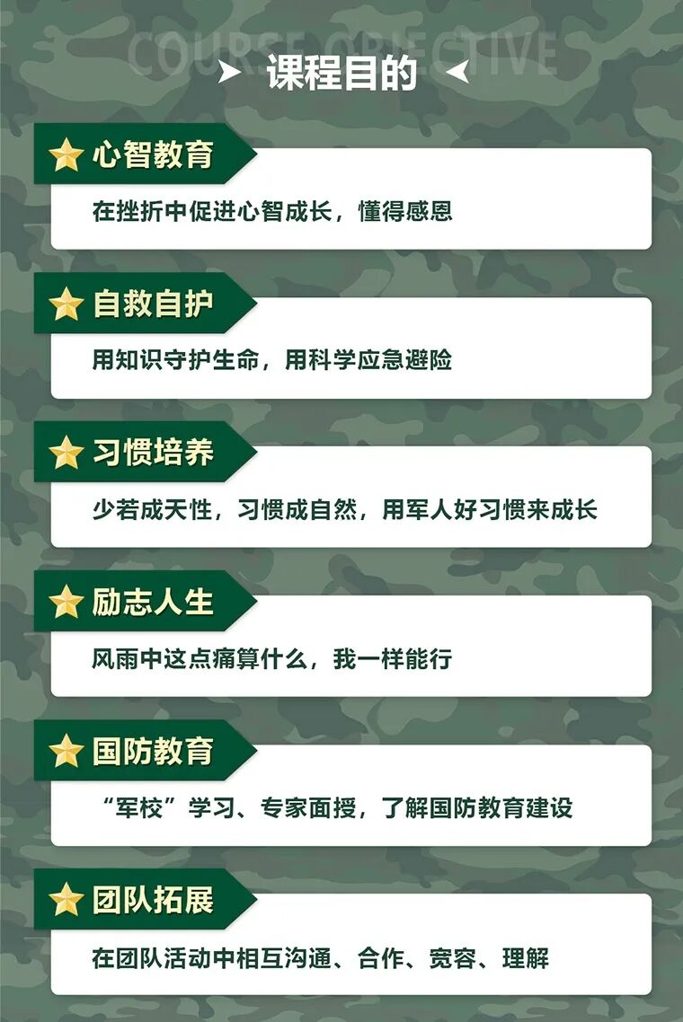★军事训练+行为习惯训练:通过军事化的行为训练,由外向内渗透,彻底解决内心不良根源,达到身心合一,想到可以做到,从而达到自律;