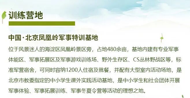 “中国少年预备役训练营”隶属于“时代传奇营地教育”旗下高端营地教育品牌,创立于2008年,专注为国内外中小学生提供高端军事冬夏令营、周末亲子活动、青少年国防教育及社会实践等体验式军旅励志活动,既是国内冬夏令营以“军事”为主题的模式开拓者,也是国内军事冬夏令营主题营中NO.1领军者。