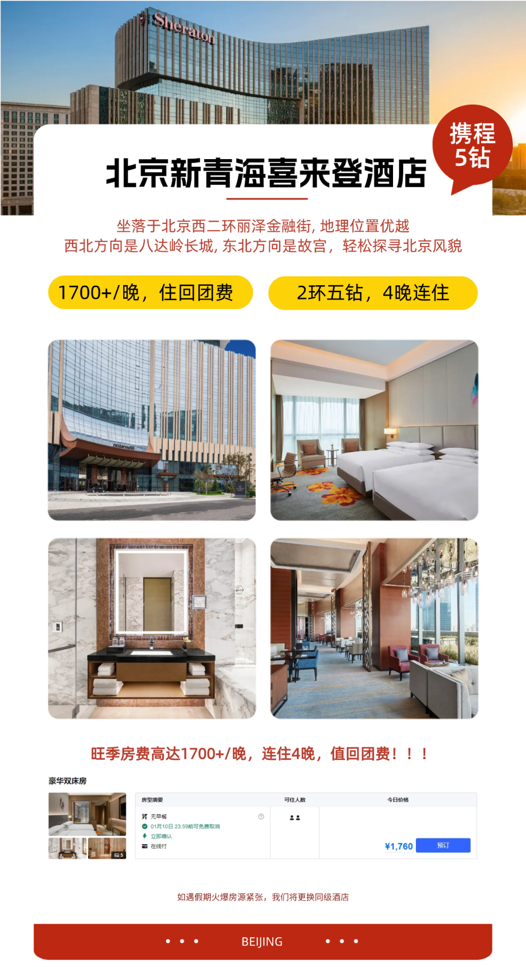 我们深知北京旺季二环内优质酒店的稀缺与昂贵,特别安排: