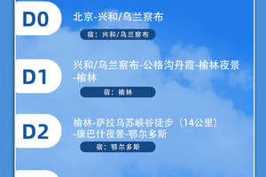 - 晚上请按集合信息准时集合出发,车上领队讲解未来行程,当晚宿兴和/乌兰察布。
