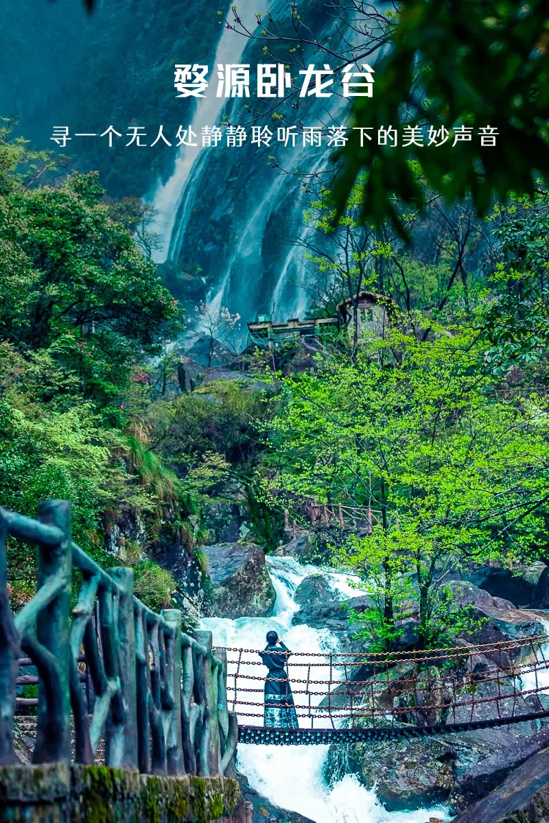 - 中午 我们前往婺源小众景点『卧龙谷』来到这里才知道原来这里藏着如此震撼的瀑布,仿佛走进了金庸先生笔下的仙侠世界。大家可以徒步或索道上山,到达大龙瀑和白龙瀑,一览疑是银河落九天的高山瀑布;之后徒步下山,途经七叠泉、水帘瀑、箜篌桥等景点,行走于森林水世界之间,沿途与碧波荡漾的深潭彩池作伴,深入天然氧吧之中,感受大自然带来的绿色心情。