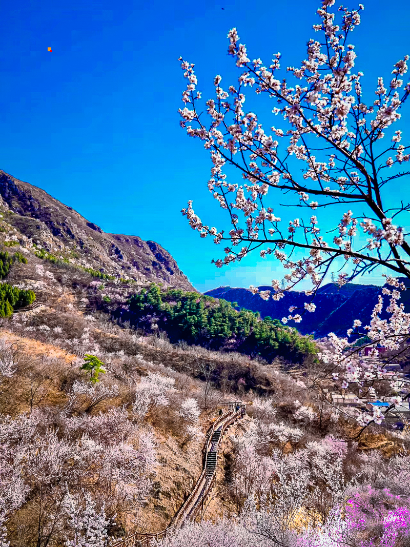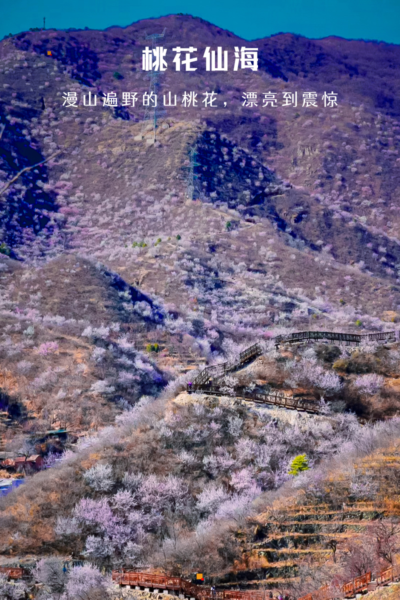 北京昌平西峪村桃花仙海,近期突然爆火网络。漫山遍野的山桃花,漂亮到震惊,也是离市区几平最近的山桃集中的山谷了,赏花栈道都在半山腰上,路两侧的山上都有。可休闲徒步一部分栈道,体力好的可以走个小环线,全方位欣赏桃花海。
