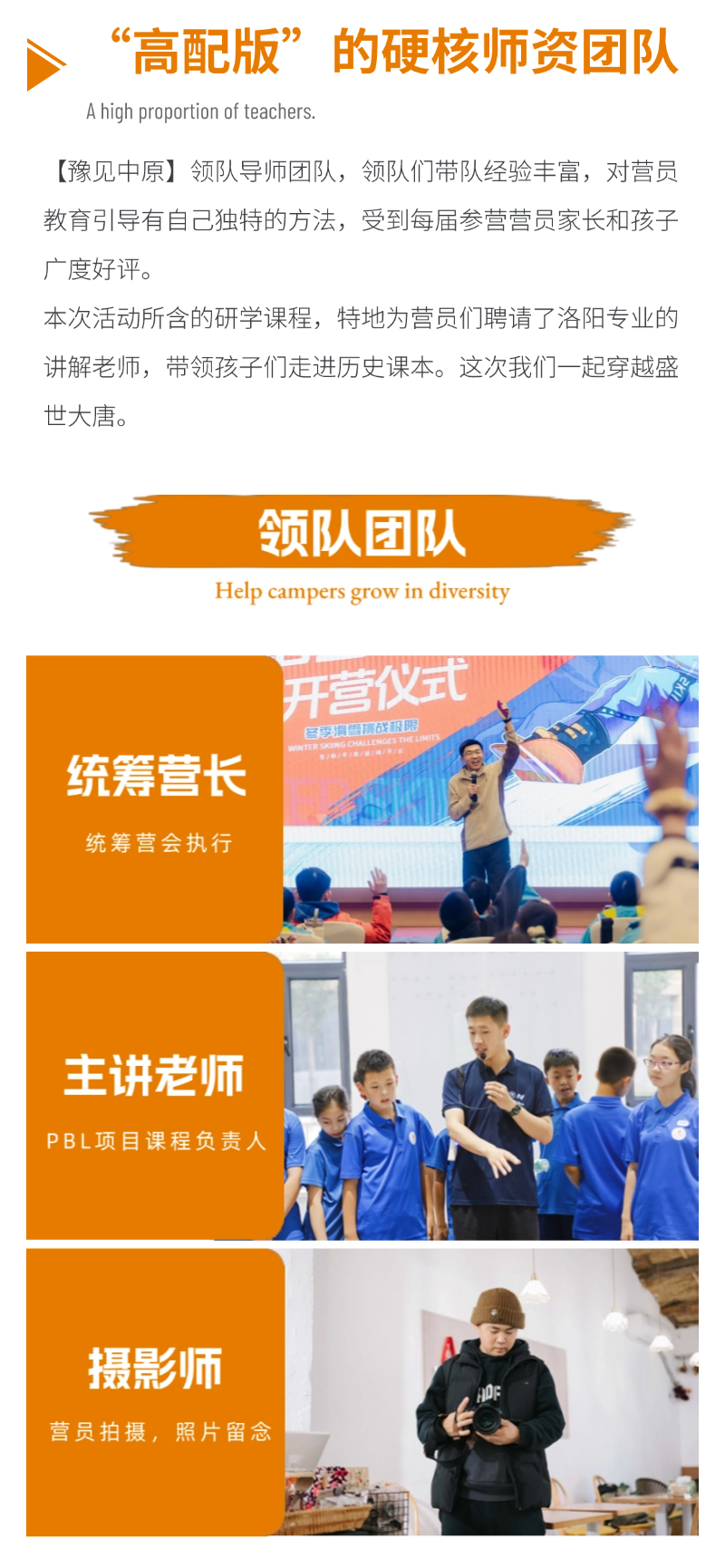 营员将在这里开启一场别样的穿越之旅,以“沉浸式体验”为核心,自发的跟着剧情去探寻武则天的故事,了解唐朝时期政治,经济,文化内容,探寻大唐风云人物的生平事迹。